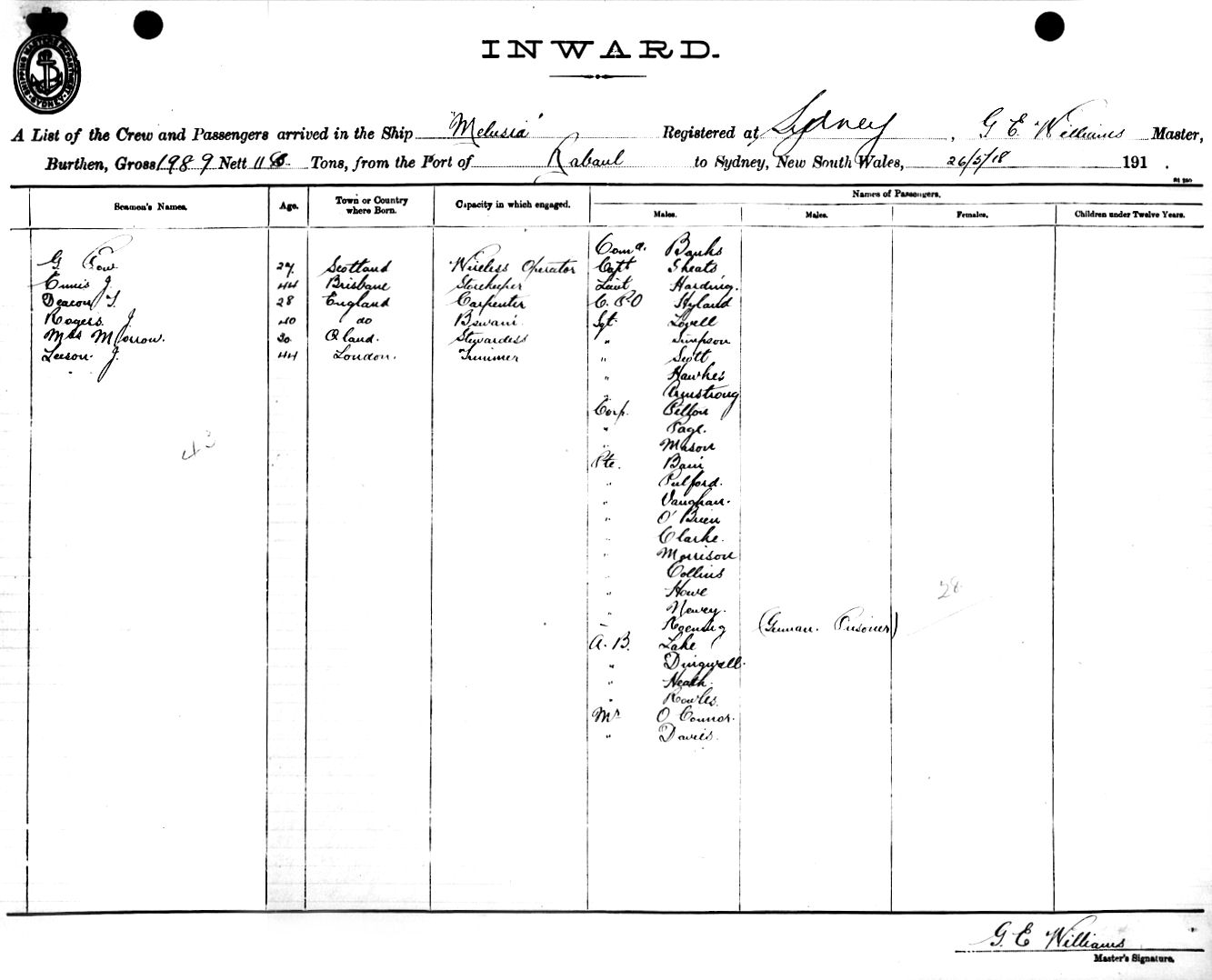 MELUSIAOF SYDNEY, G.E. WILLIAMS, MASTER, BURTHEN 1989/1183 TONS FROM THE PORT OF RABAUL TO SYDNEY, NEW SOUTH WALES, 4TH JUNE 1918 |