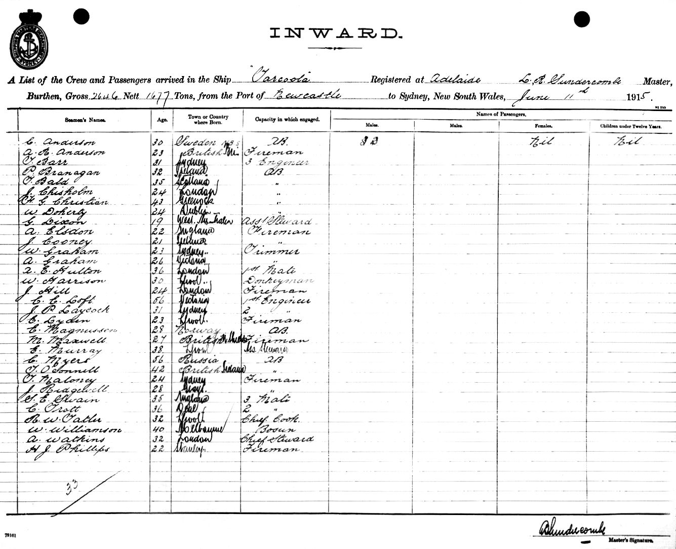 TARCOOLAOF ADELAIDE, L.R. SUNDERCOMBE, MASTER, BURTHEN 2646/1677 TONS FROM THE PORT OF NEWCASTLE TO SYDNEY, NEW SOUTH WALES, 11TH JUNE 1918 |