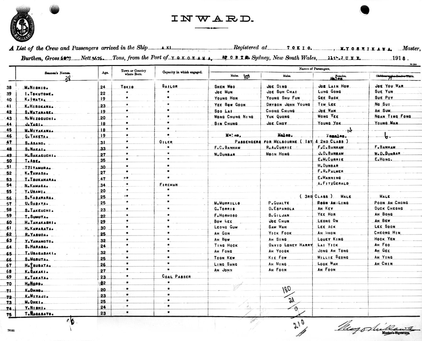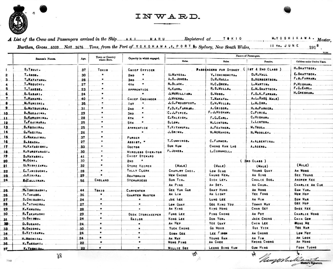 AKI MARUOF TOKIO, M. YOSHIKAWA, MASTER, BURTHEN 6009/3676 TONS FROM THE PORT OF YOKOHAMA & PORTS TO SYDNEY, NEW SOUTH WALES, 11TH JUNE 1918 |