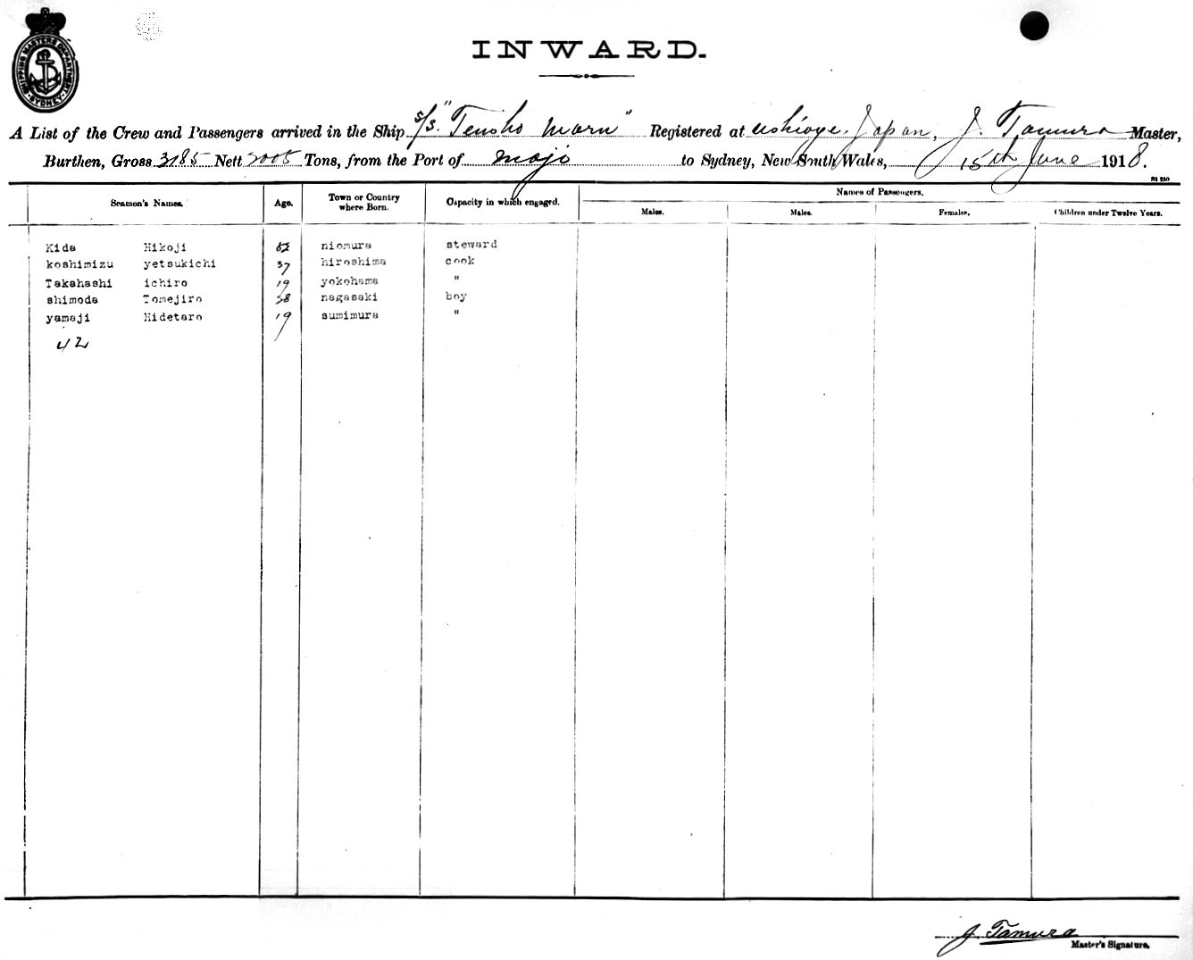 TENSHO MARUOF USHIOYE, JAPAN, J. TAMURA, MASTER, BURTHEN 3185/2005 TONS FROM THE PORT OF MOJI TO SYDNEY, NEW SOUTH WALES, 15TH JUNE 1918 |