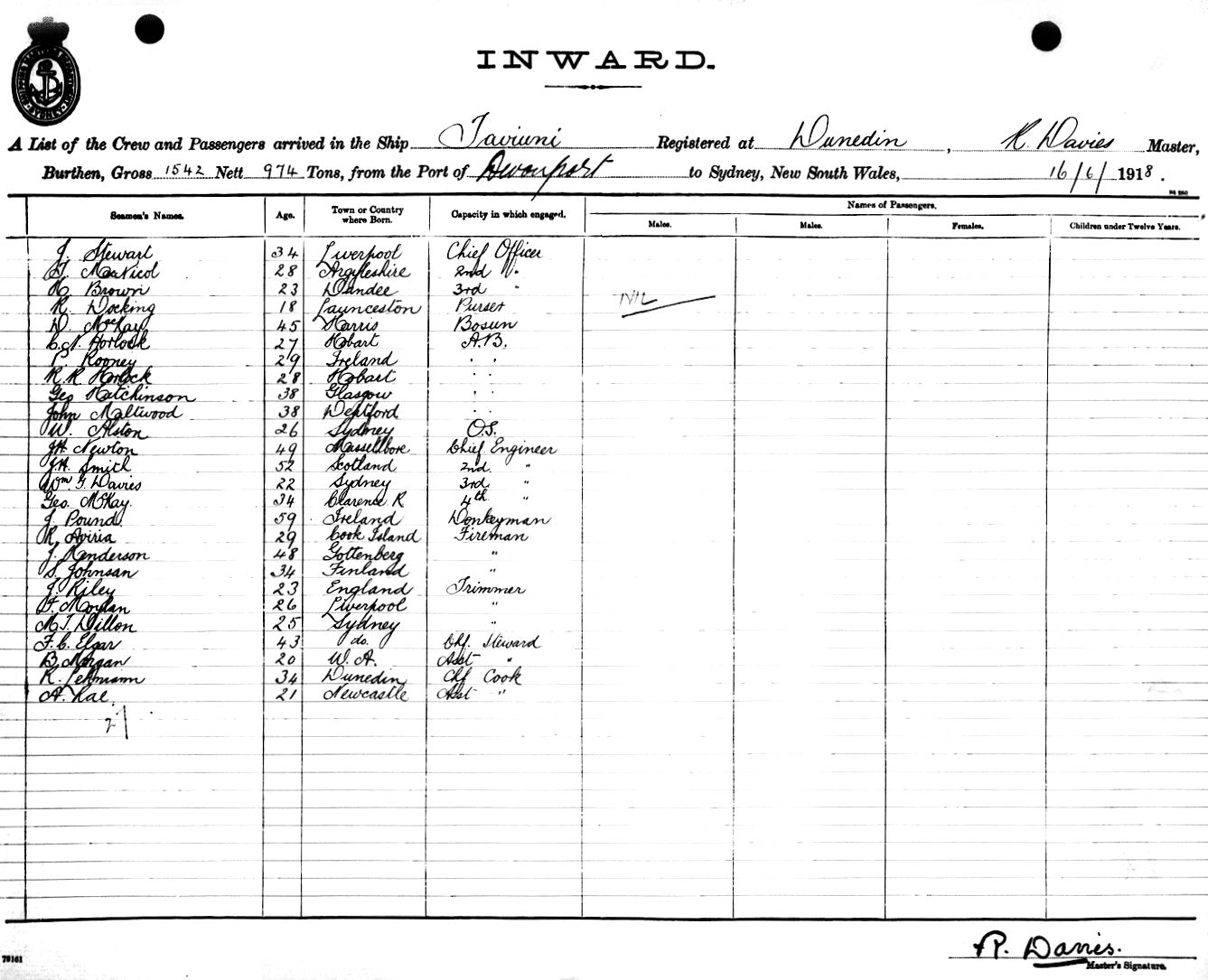 TAVIUNIOF DUNEDIN, R. DAVIES, MASTER, BURTHEN 1542/974 TONS FROM THE PORT OF DEVONPORT TO SYDNEY, NEW SOUTH WALES, 16TH JUNE 1918 |