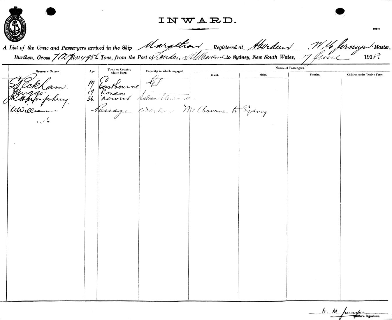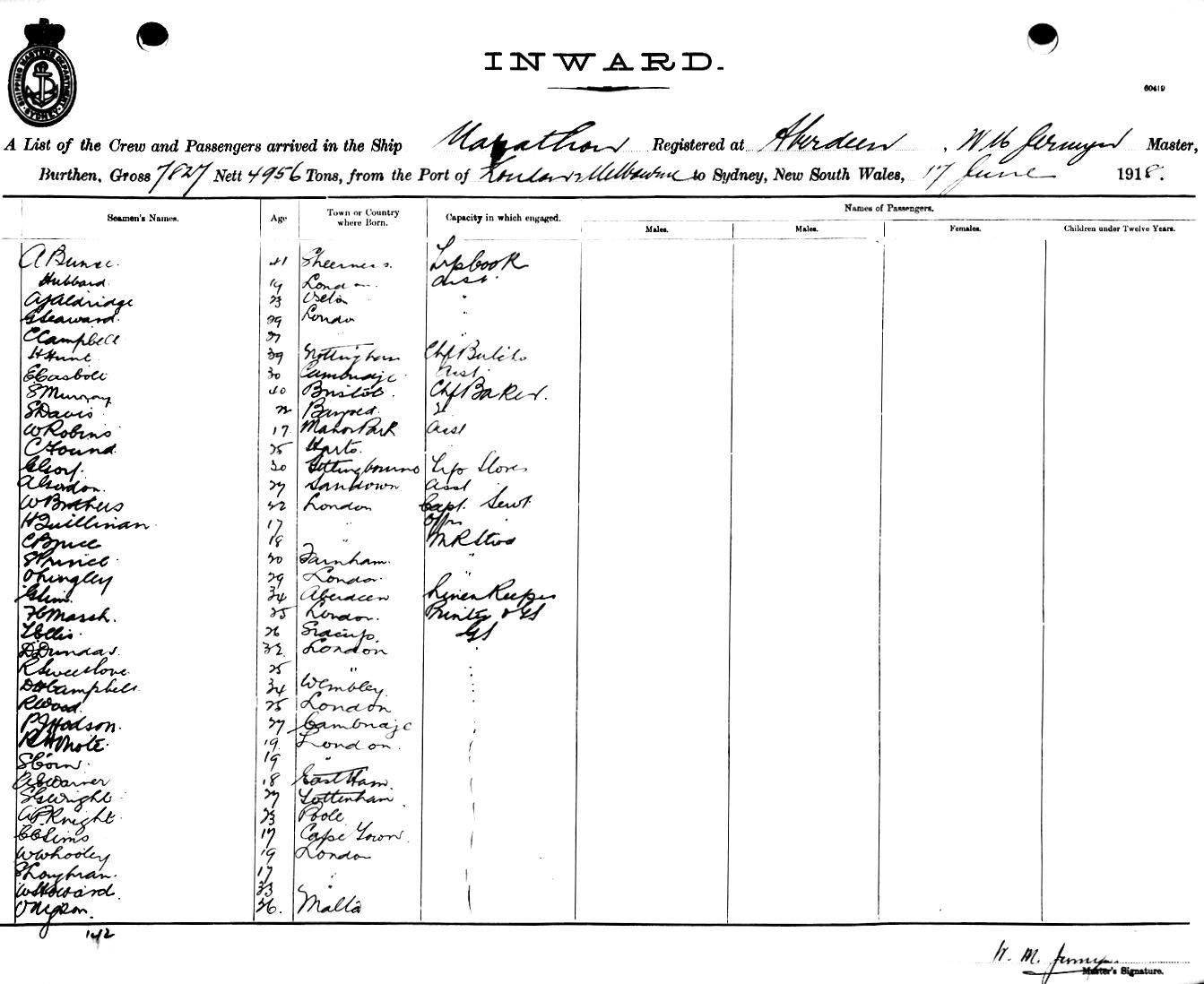 MARATHONOF ABERDEEN, W.M. JERMYN, MASTER, BURTHEN 7827/4956 TONS FROM THE PORT OF LONDON via MELBOURNE TO SYDNEY, NEW SOUTH WALES, 17TH JUNE 1918 |