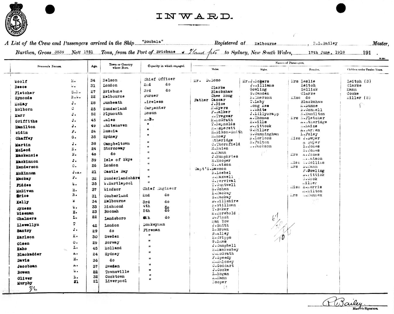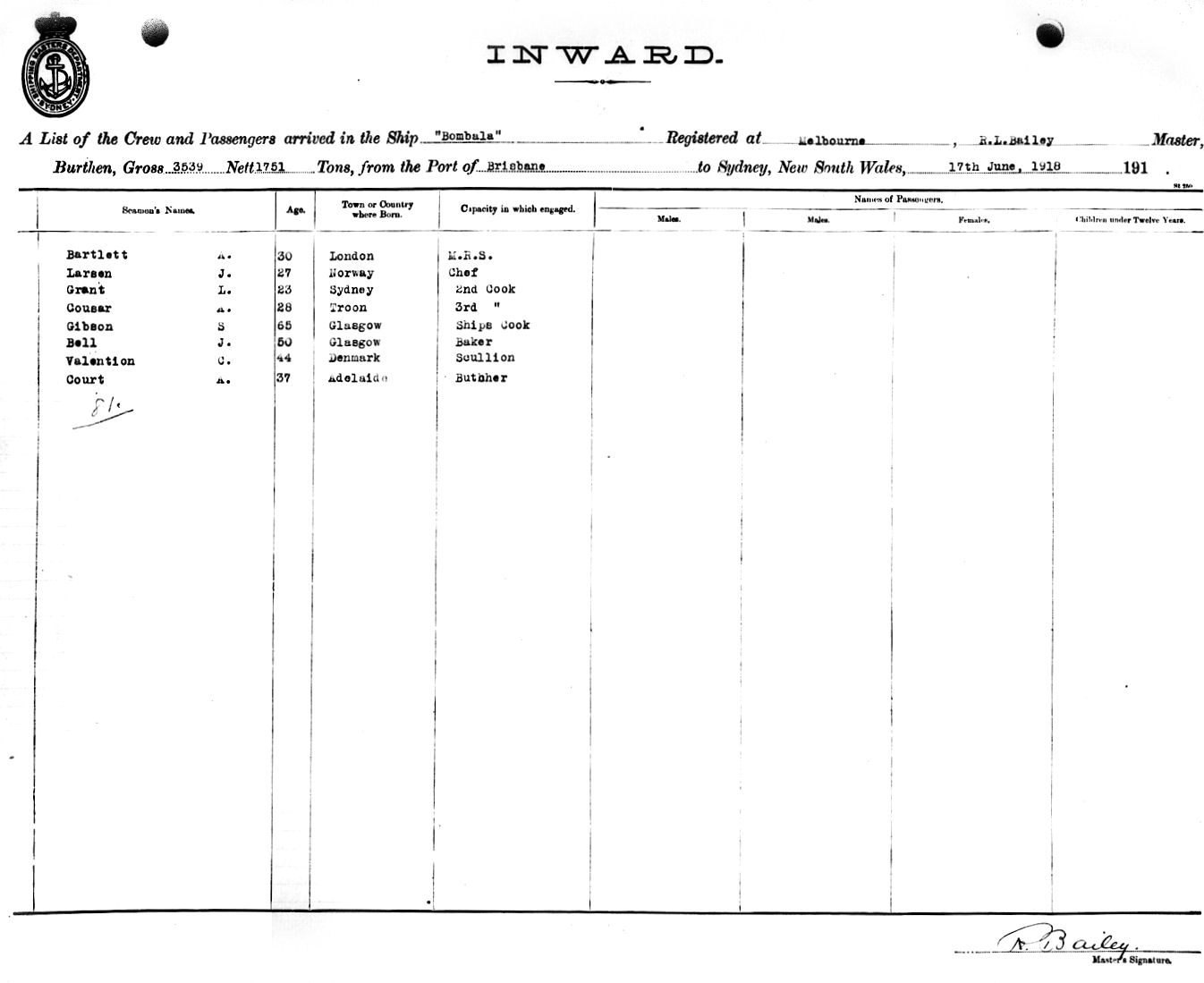 BOMBALAOF MELBOURNE, R.L. BAILEY, MASTER, BURTHEN 3539/1751 TONS FROM THE PORT OF BRISBANE & Q'LAND PORTS TO SYDNEY, NEW SOUTH WALES, 17TH JUNE 1918 |