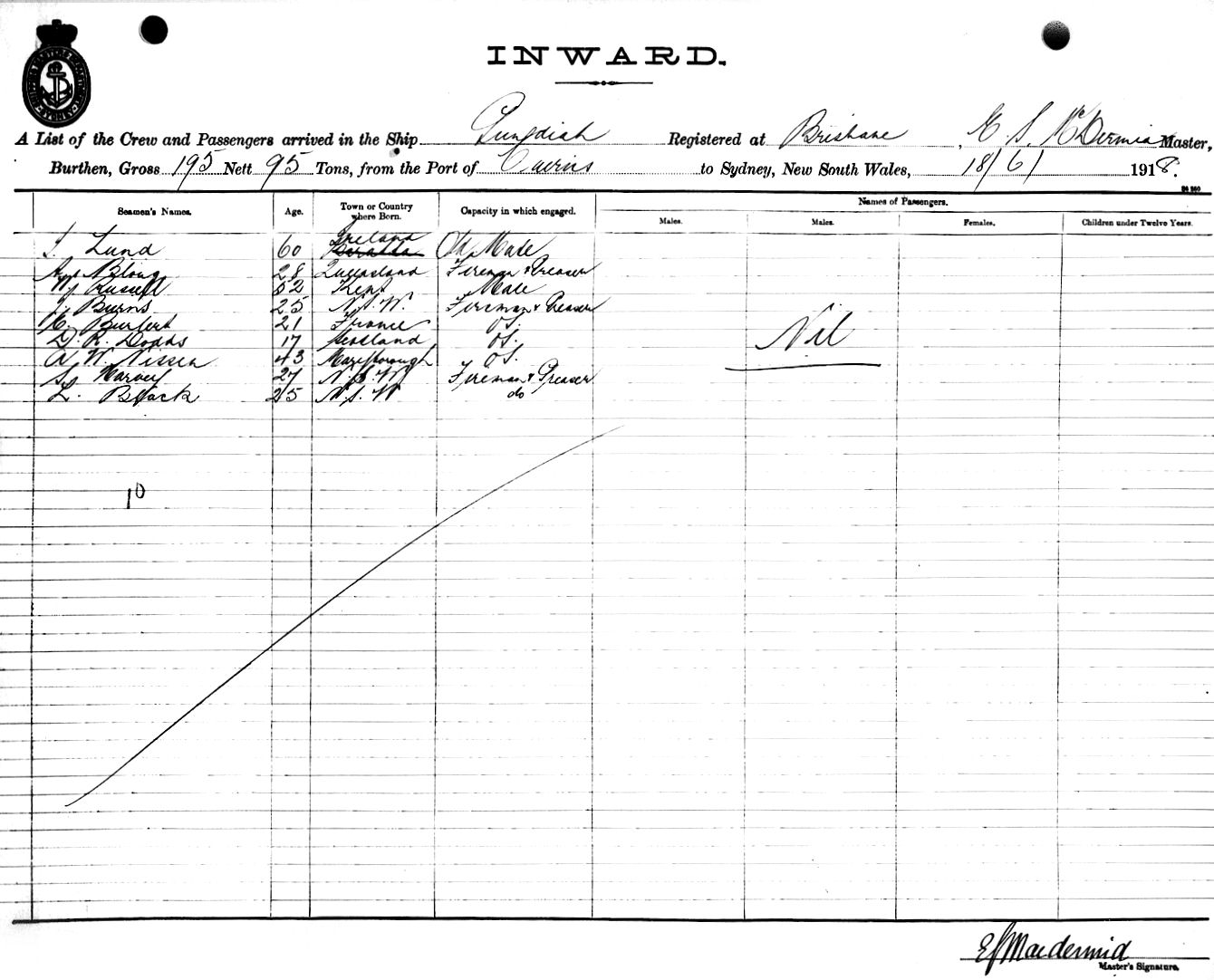 GUNDIAHOF BRISBANE, E.S. MCDERMID, MASTER, BURTHEN 195/95 TONS FROM THE PORT OF CAIRNS TO SYDNEY, NEW SOUTH WALES, 18TH JUNE 1918 |