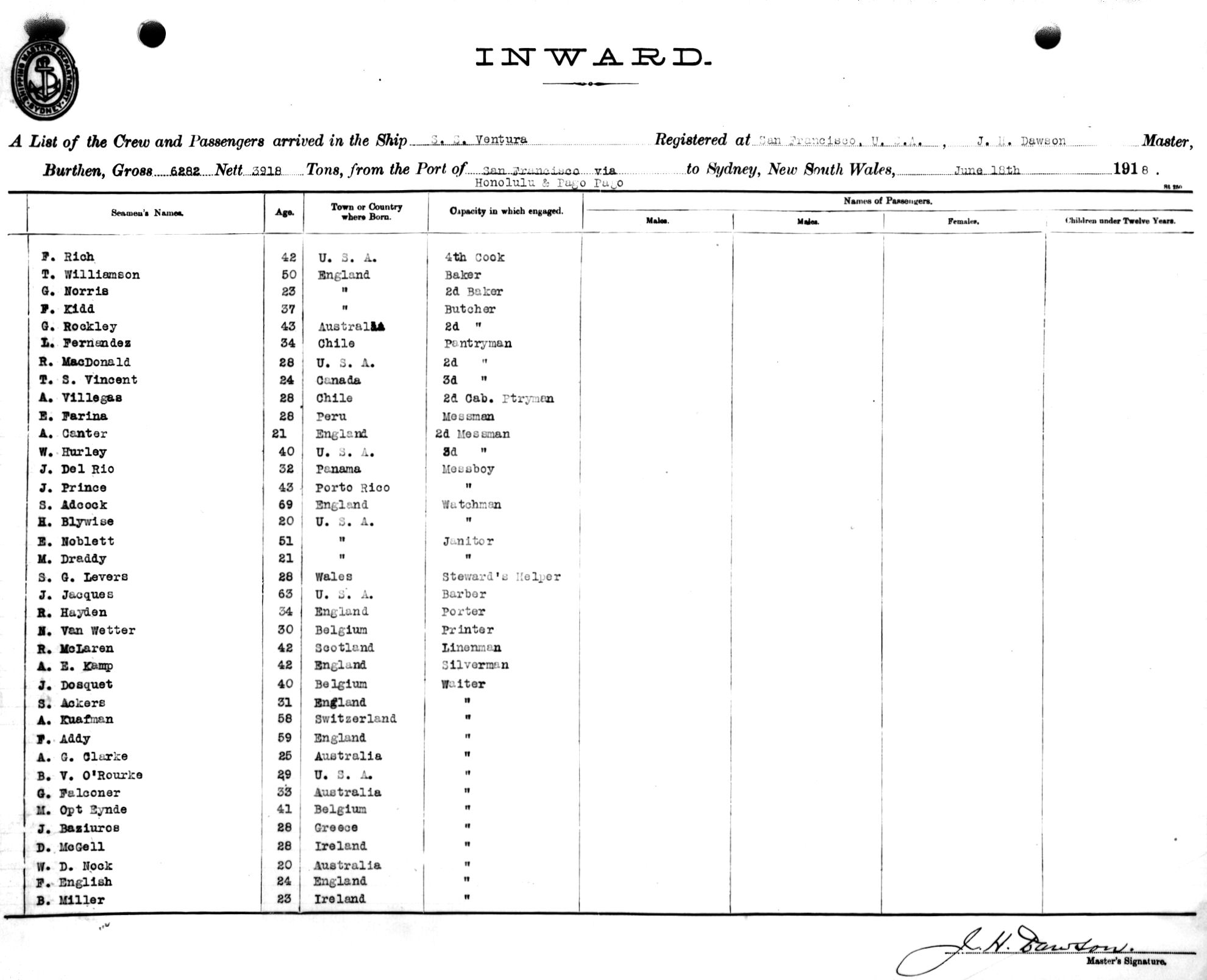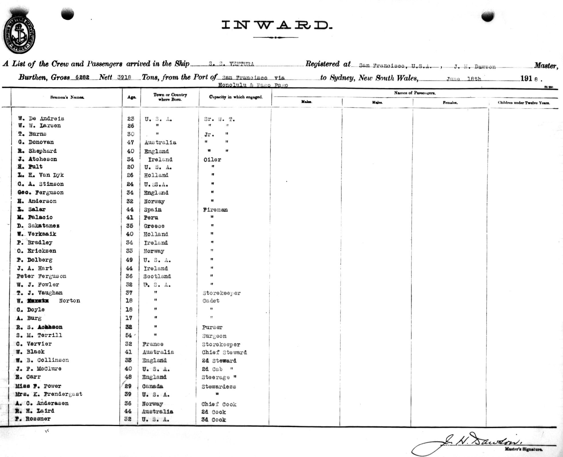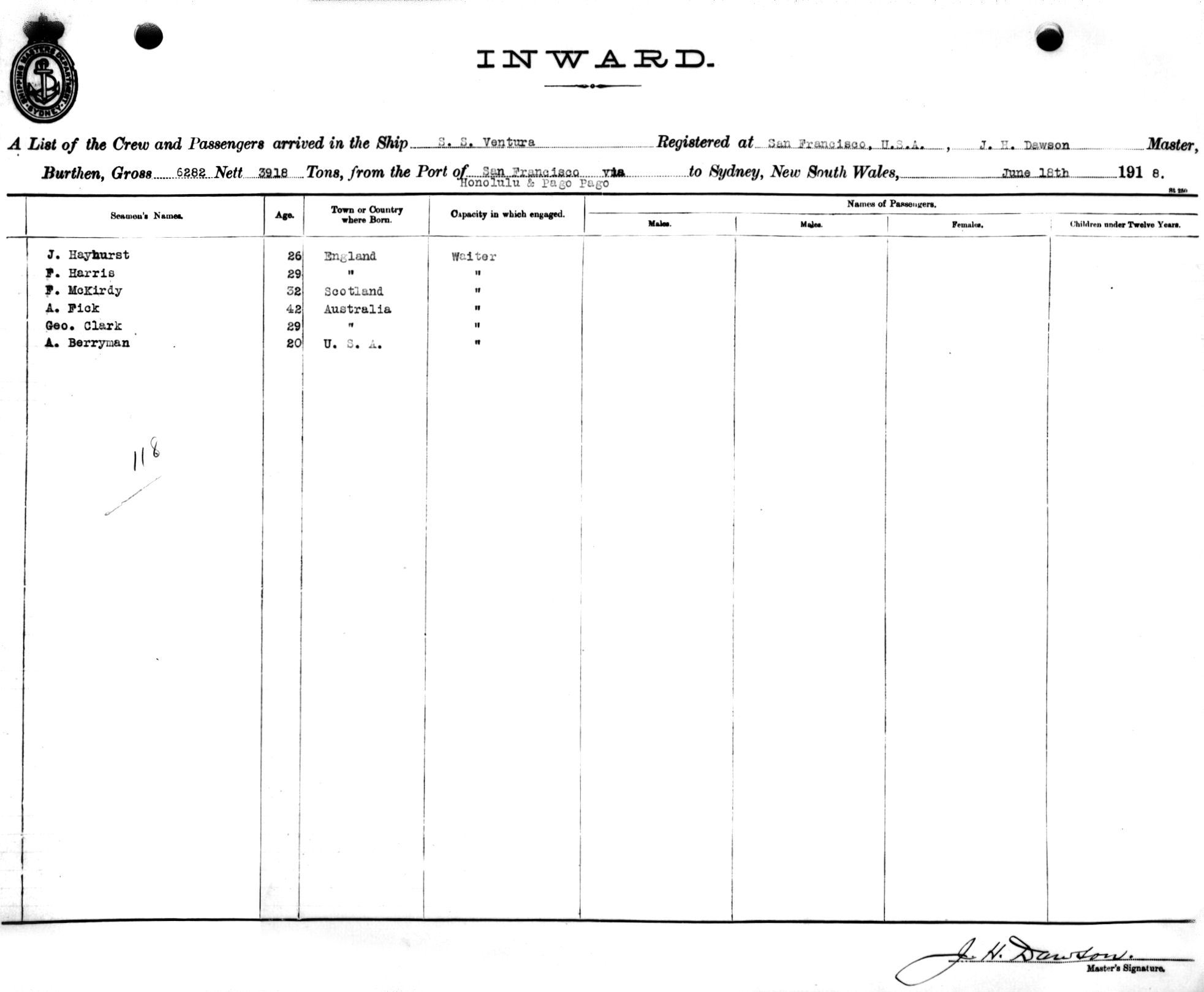 VENTURAOF SAN FRANCISCO, U.S.A., J.H. DAWSON, MASTER, BURTHEN 6282/3918 TONS FROM THE PORT OF SAN FRANCISCO via HOLOLULU & PAGO PAGO TO SYDNEY, NEW SOUTH WALES, 18TH JUNE 1918 |