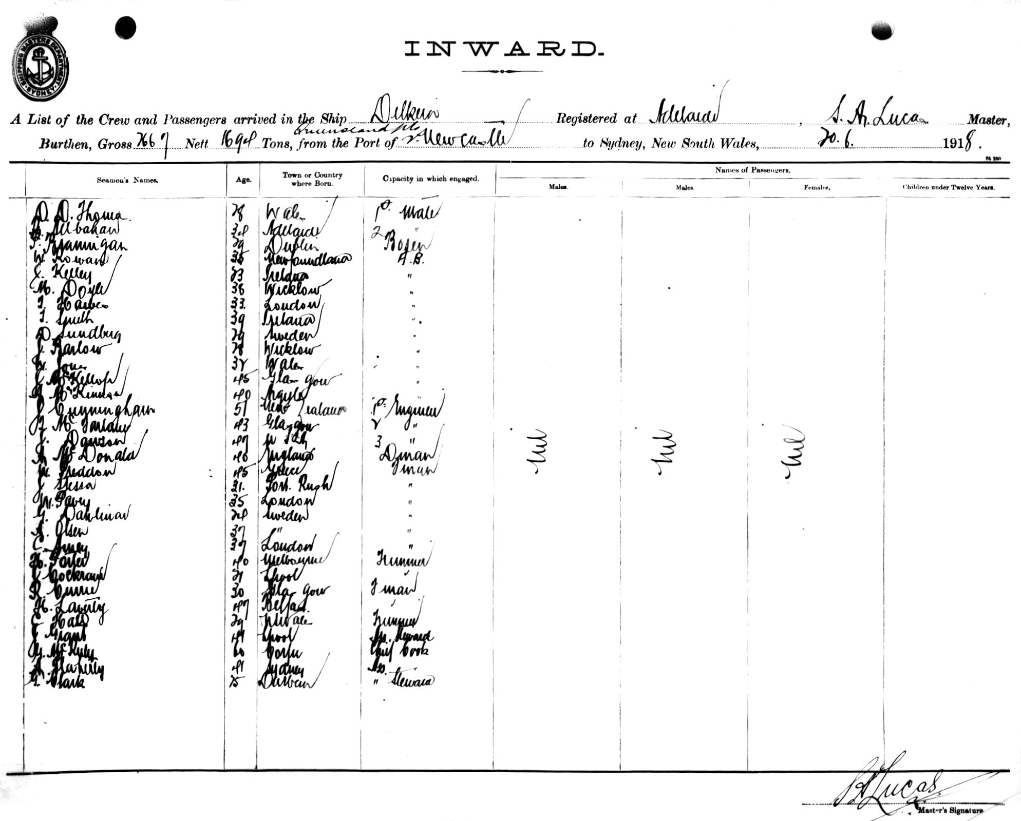 DILKERAOF ADELAIDE, S. A. LUCAS, MASTER, BURTHEN 2667/1694 TONS FROM QUENSLAND PORTS via NEWCASTLE TO SYDNEY, NEW SOUTH WALES, 20TH JUNE 1918 |