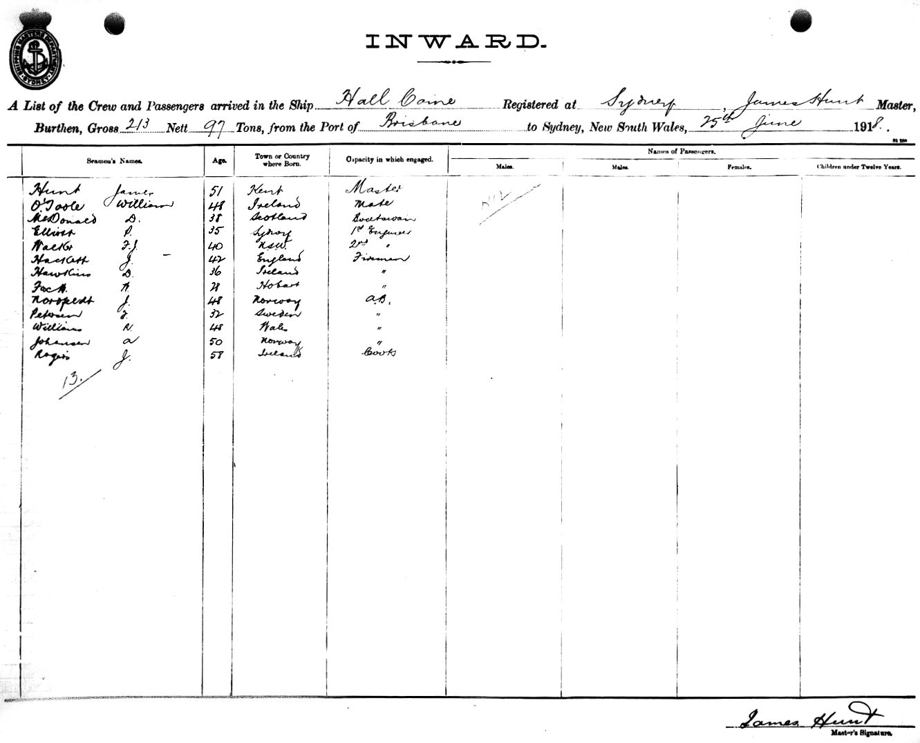 HALL CAINEOF SYDNEY, JAMES HUNT, MASTER, BURTHEN 213/97 TONS FROM THE PORT OF BRISBANE TO SYDNEY, NEW SOUTH WALES, 25TH JUNE 1918 |