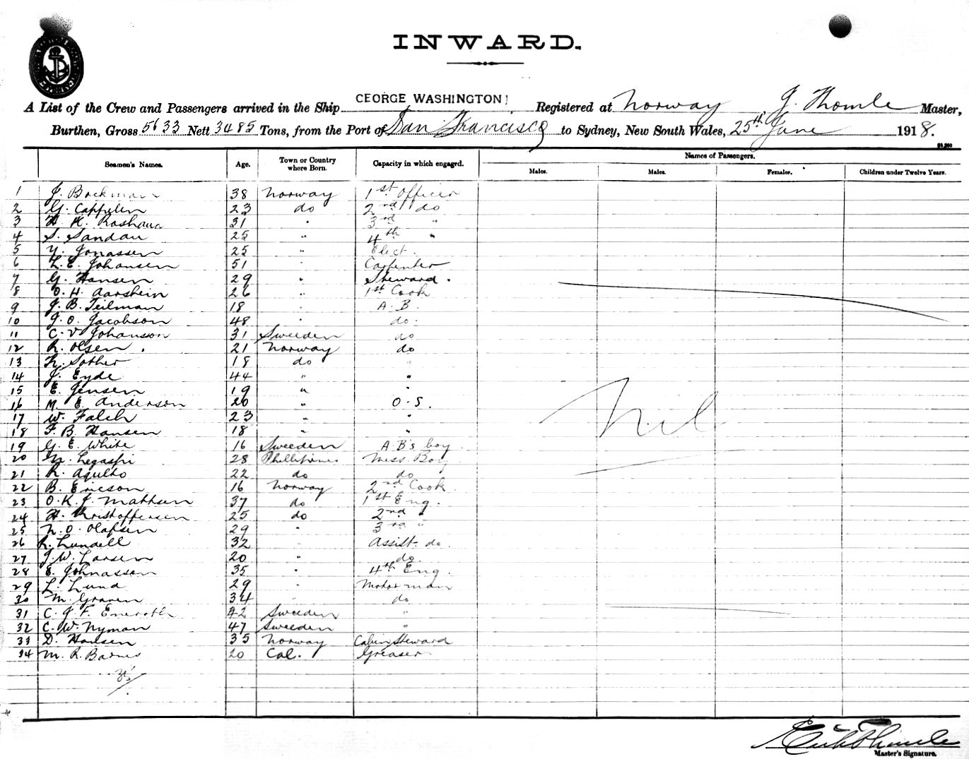 GEORGE WASHINGTONOF NORWAY, THOMLE, MASTER, BURTHEN 5633/3485 TONS FROM THE PORT OF SAN FRANCISCO TO SYDNEY, NEW SOUTH WALES, 25TH JUNE 1918 |