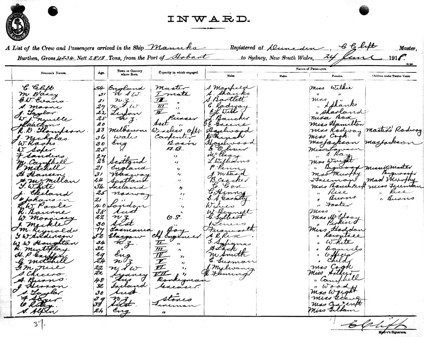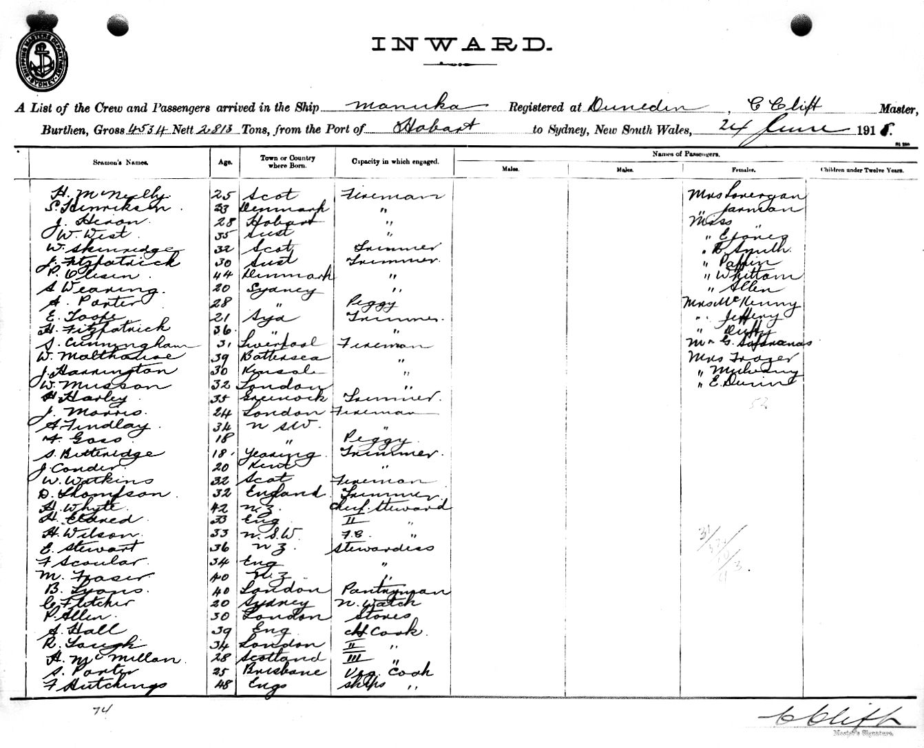 MANUKAOF DUNEDIN, C. CLIFT, MASTER, BURTHEN 4534/2813 TONS FROM THE PORT OF HOBART TO SYDNEY, NEW SOUTH WALES, 24TH JUNE 1918 |