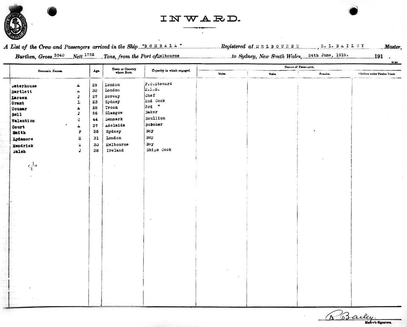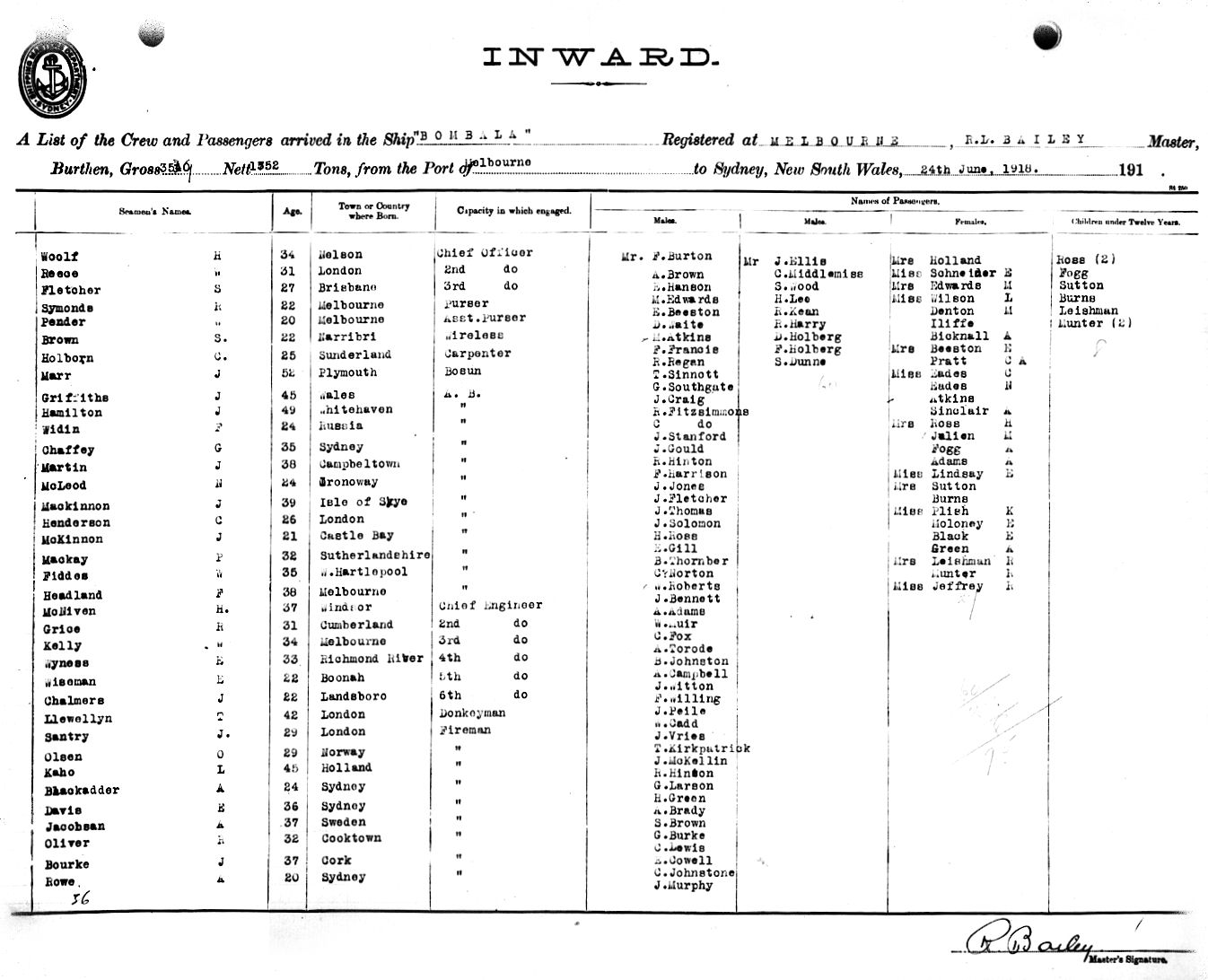 BOMBALAOF MELBOURNE, R.L. BAILEY, MASTER, BURTHEN 3540/1752 TONS FROM THE PORT OF MELBOURNE TO SYDNEY, NEW SOUTH WALES, 24TH JUNE 1918 |