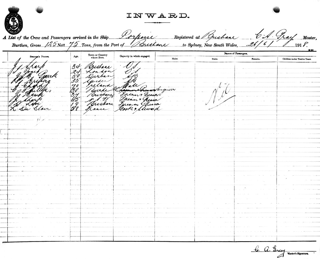 PORPOISEOF BRISBANE, C.A. GRAY, MASTER, BURTHEN 125/75 TONS FROM THE PORT OF BRISBANE TO SYDNEY, NEW SOUTH WALES, 26TH JUNE 1918 |