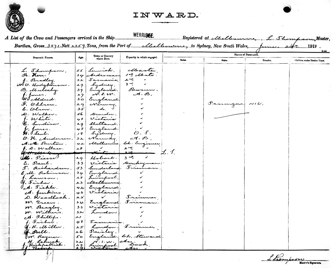 WERRIBEEOF MELBOURNE, L. THOMPSON, MASTER, BURTHEN 3871/2359 TONS FROM THE PORT OF MELBOURNE TO SYDNEY, NEW SOUTH WALES, 24TH JUNE 1918 |