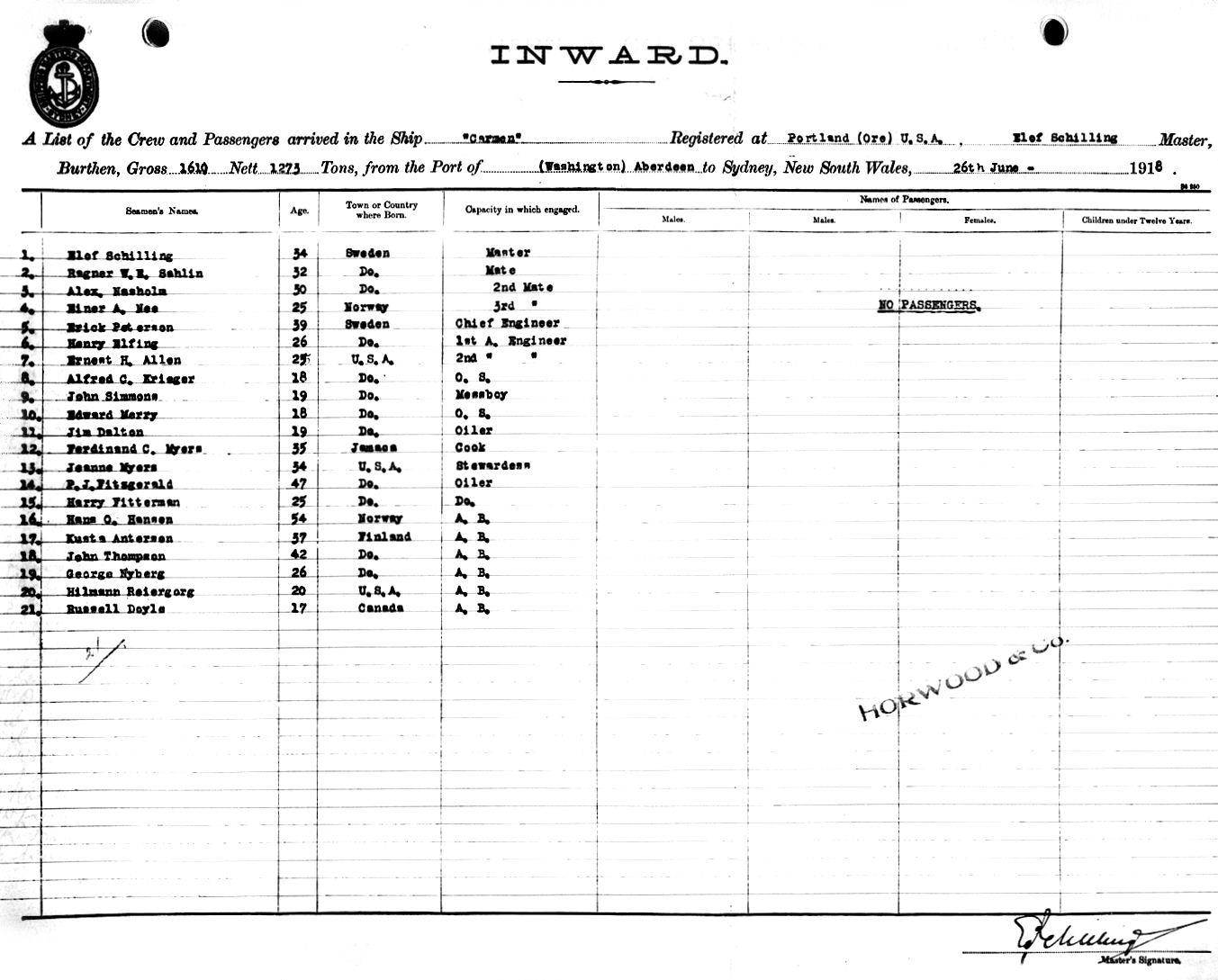CARMENOF PORTLAND, OREGON, ELEF SCHILLING, MASTER, BURTHEN 1610/1273 TONS FROM THE PORT OF ABERDEEN, WASHINGTON STATE TO SYDNEY, NEW SOUTH WALES, 26TH JUNE 1918 |