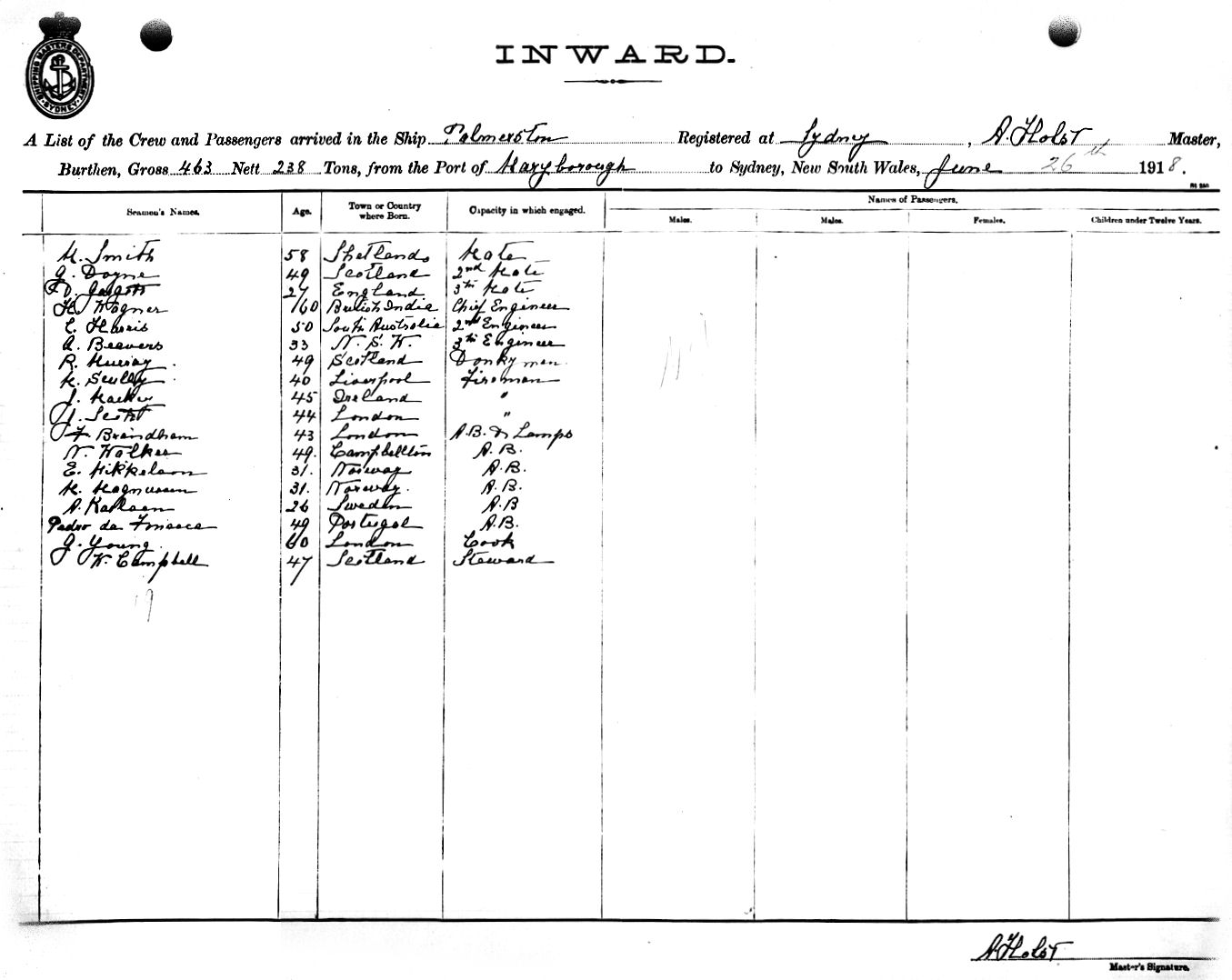 PALMERSTONOF SYDNEY, A. HOLST, MASTER, BURTHEN 463/238 TONS FROM THE PORT OF MARYBOROUGH TO SYDNEY, NEW SOUTH WALES, 26TH JUNE 1918 |