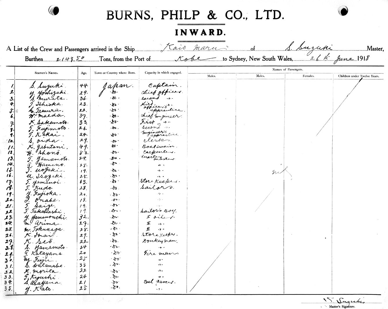 KAIWO MARUOF JAPAN, S. SUZUKI, MASTER, BURTHEN 2148.50 TONS FROM THE PORT OF KOBE, JAPAN TO SYDNEY, NEW SOUTH WALES, 26TH JUNE 1918 |