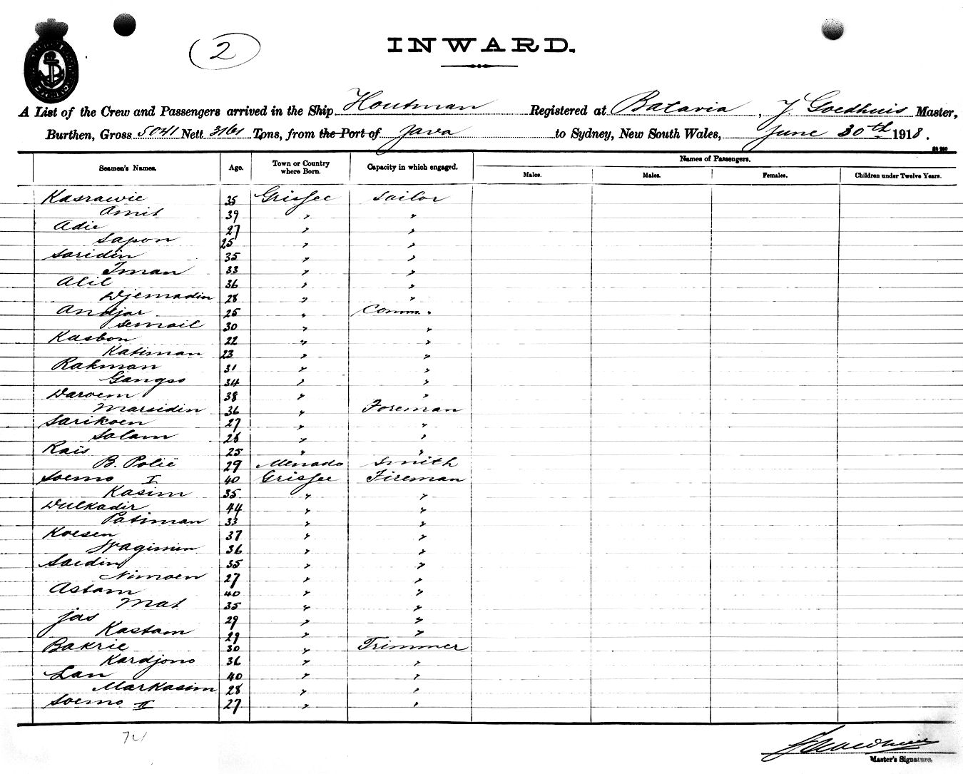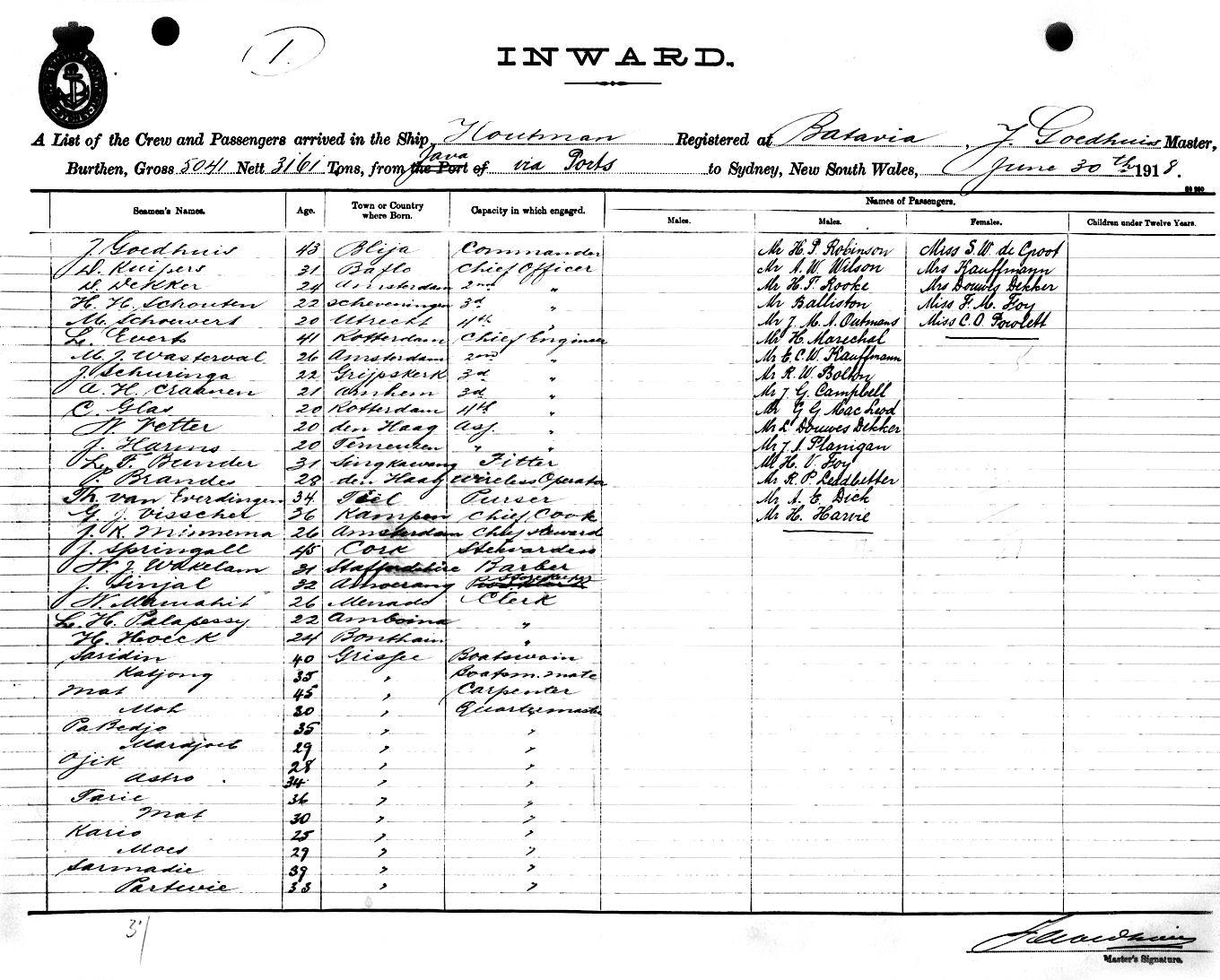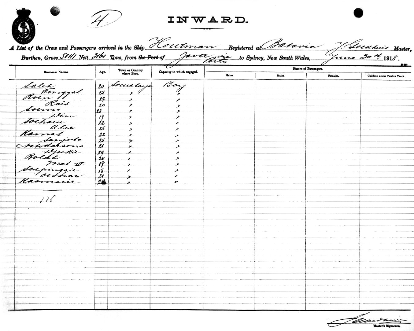 HOUTMANOF BATAVIA, J. GOEDHUIS, MASTER, BURTHEN 5041/3161 TONS FROM THE PORT OF JAVA via PORTS TO SYDNEY, NEW SOUTH WALES, 30TH JUNE 1918 |