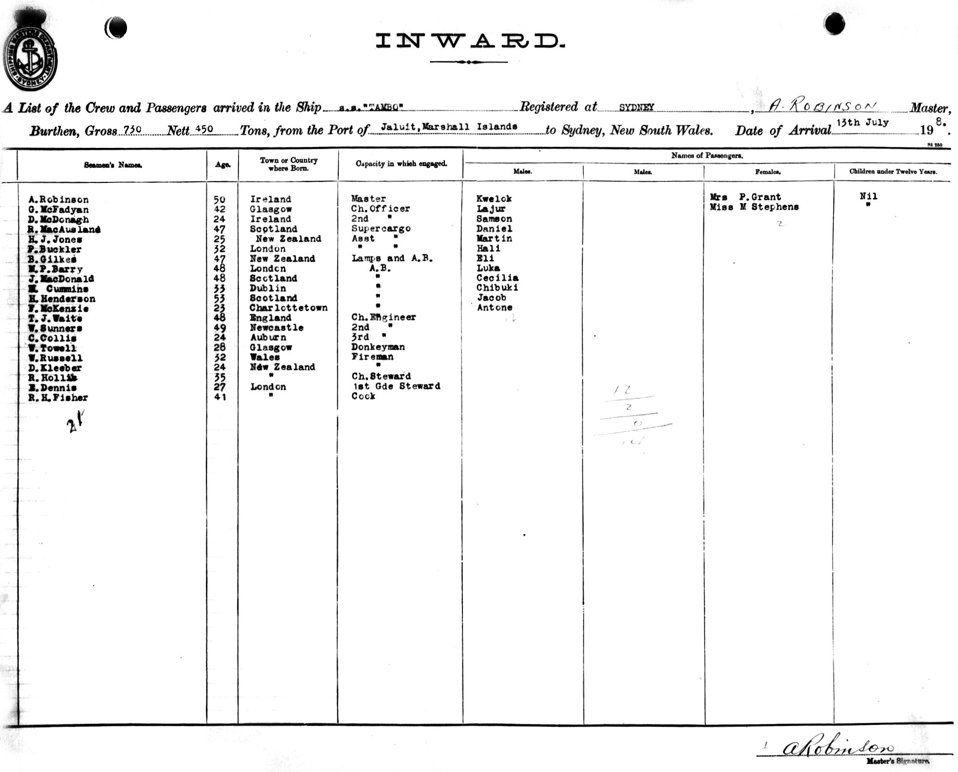 TAMBOOF SYDNEY, A. ROBINSON, MASTER, BURTHEN 730 / 450 TONS FROM THE PORT OF JALUIT, MARSHALL ISLANDS TO SYDNEY, NEW SOUTH WALES, 13TH JULY 1918 |