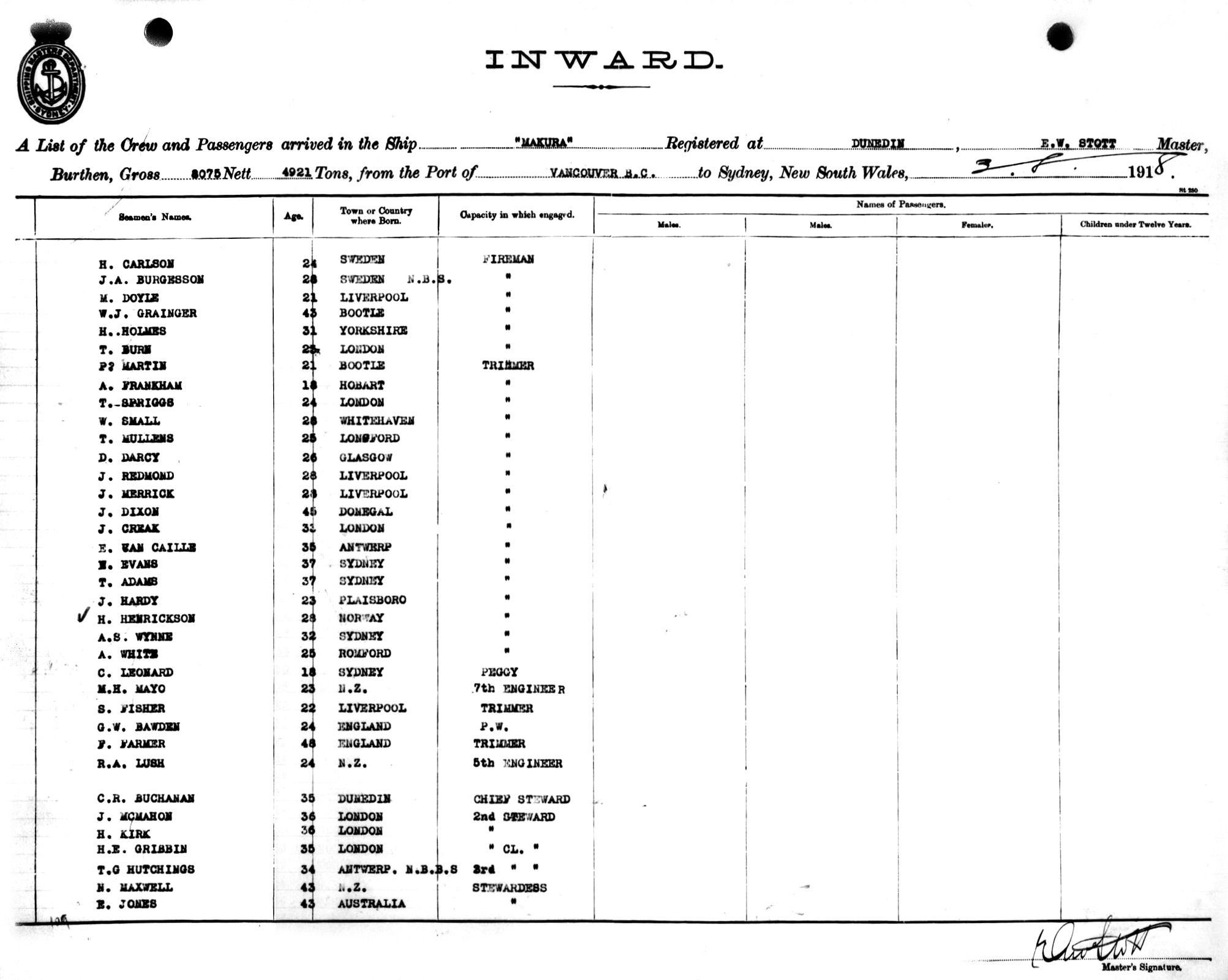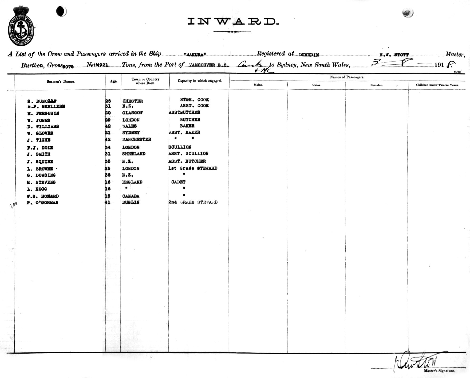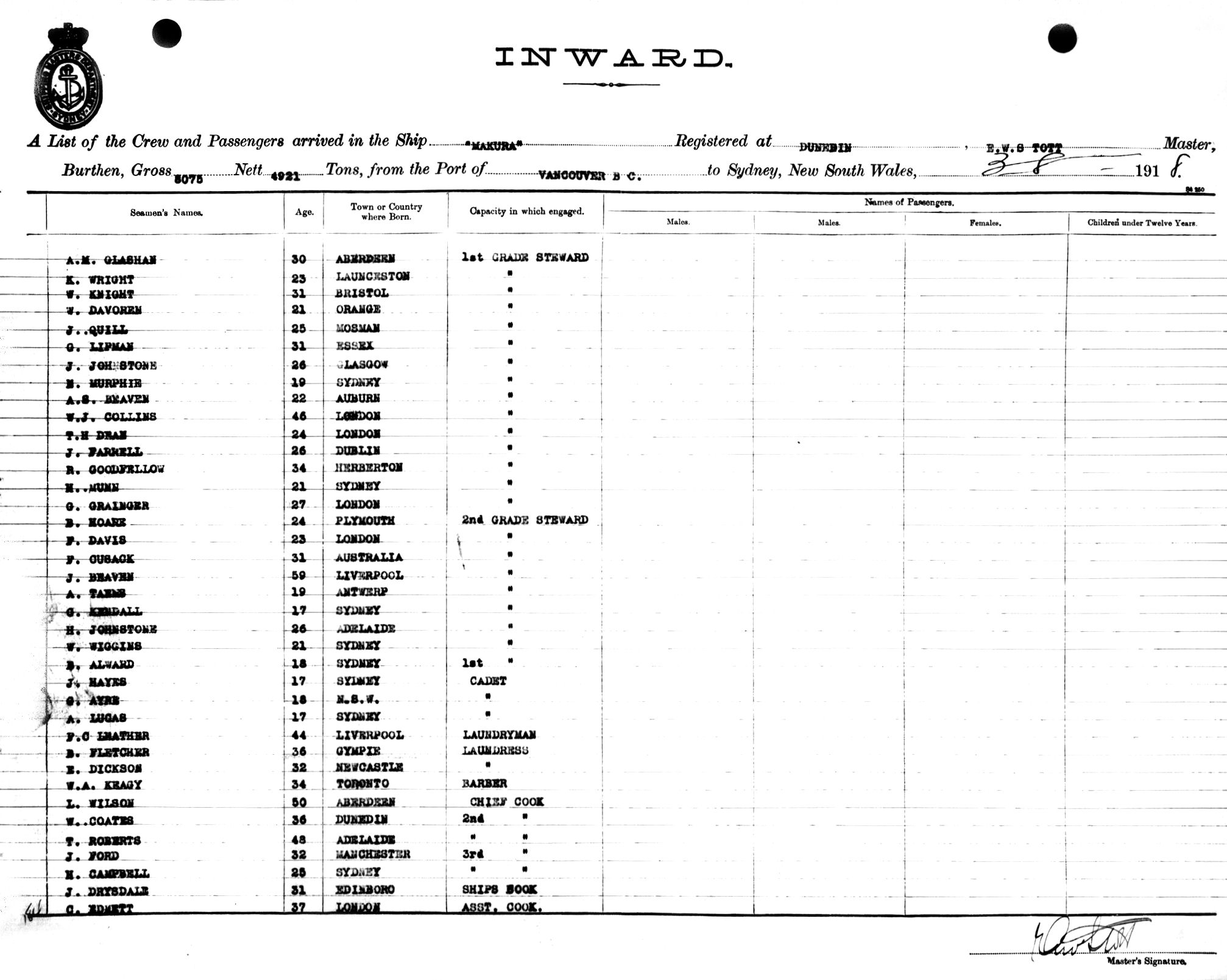 Mariners and ships in Australian Waters | MAKURAOF DUNEDIN, E. W. STOTT, MASTER, BURTHEN 8075 GROSS/4921 NETT TONS FROM THE PORT OF VANCOUVER via AUCKLAND & NEWCASTLE TO SYDNEY, NEW SOUTH WALES, 3RD AUGUST, 1918 |