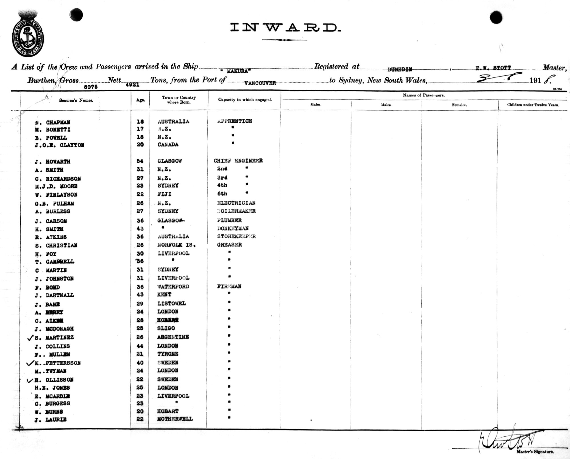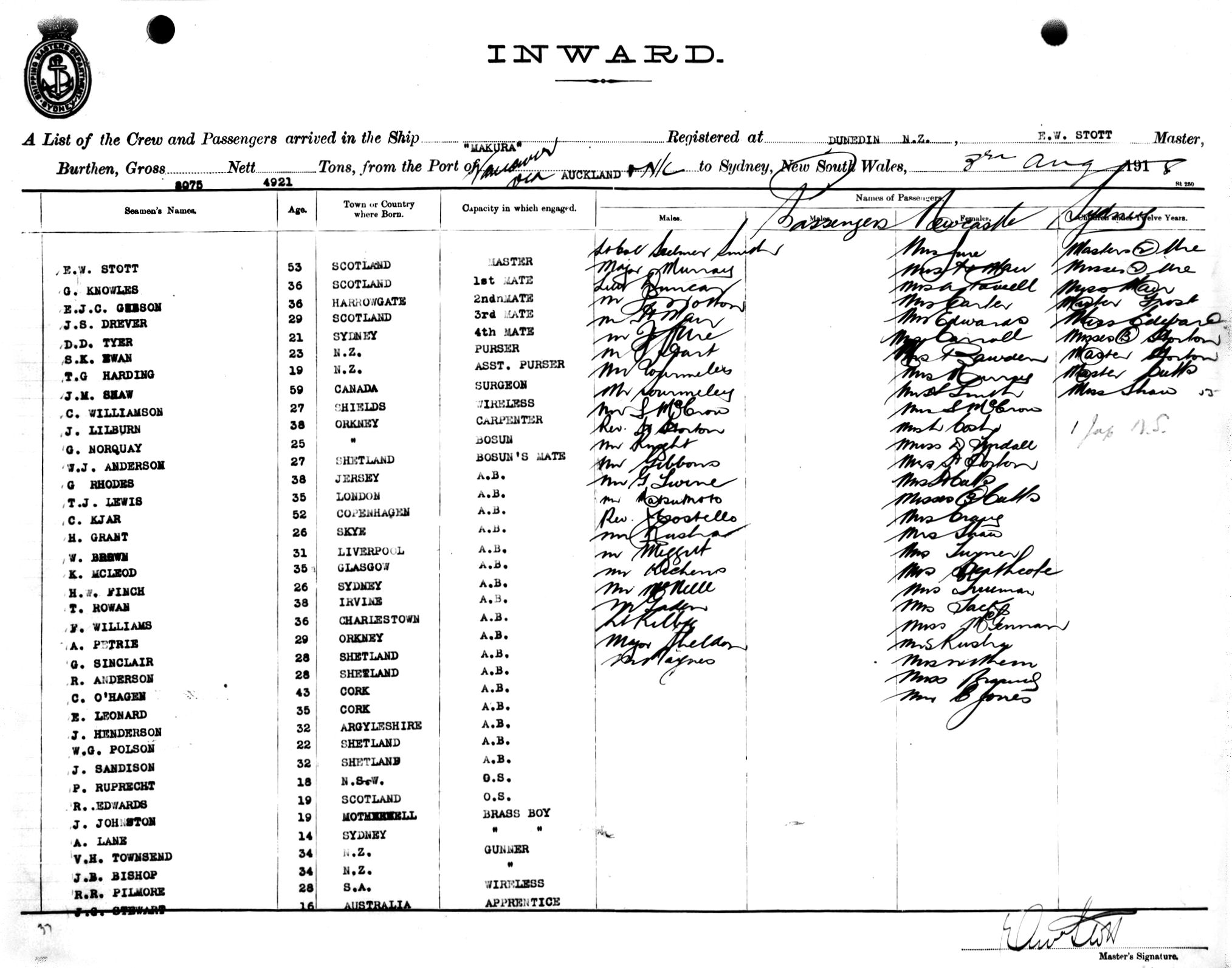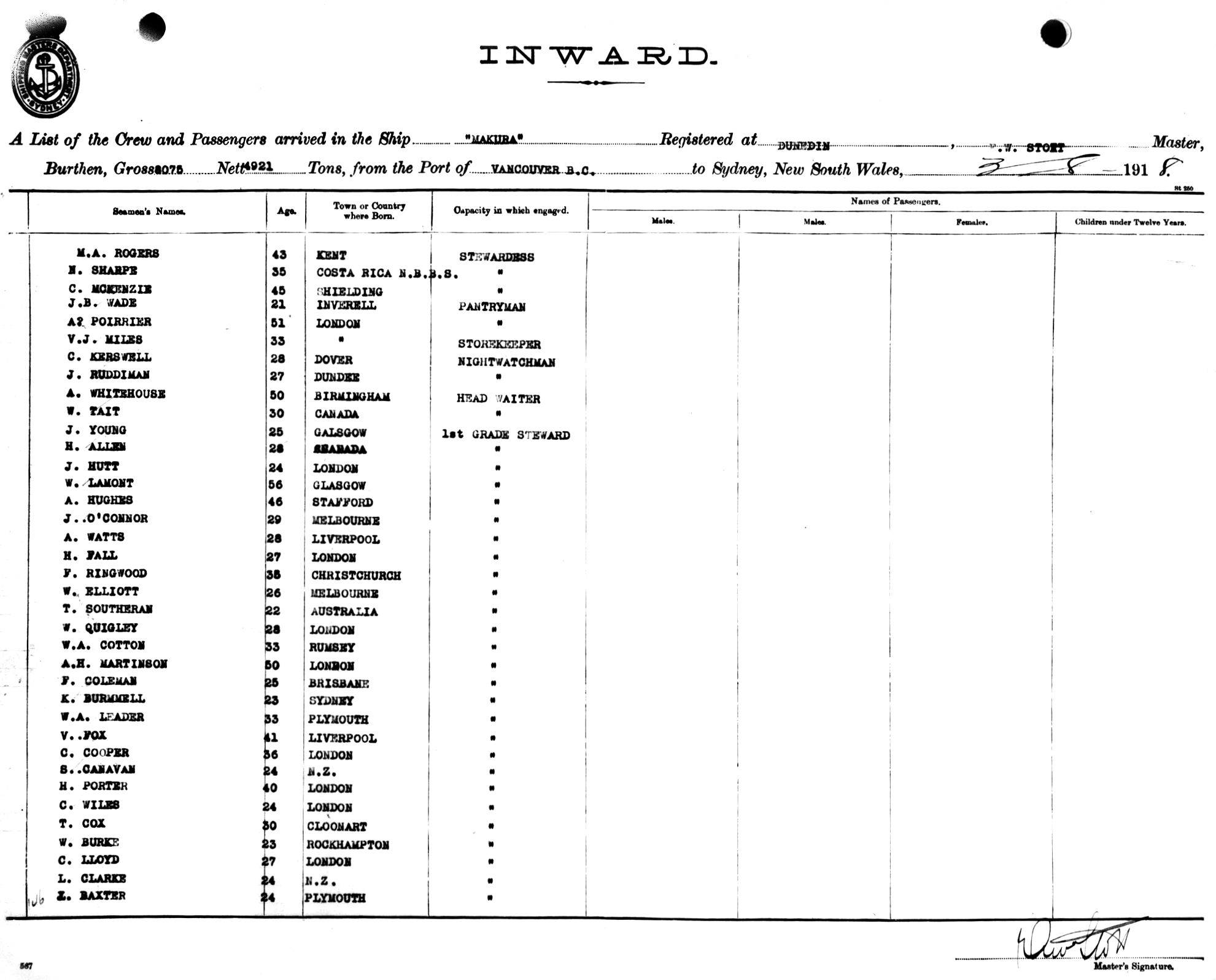 Mariners and ships in Australian Waters | MAKURAOF DUNEDIN, E. W. STOTT, MASTER, BURTHEN 8075 GROSS/4921 NETT TONS FROM THE PORT OF VANCOUVER via AUCKLAND & NEWCASTLE TO SYDNEY, NEW SOUTH WALES, 3RD AUGUST, 1918 |