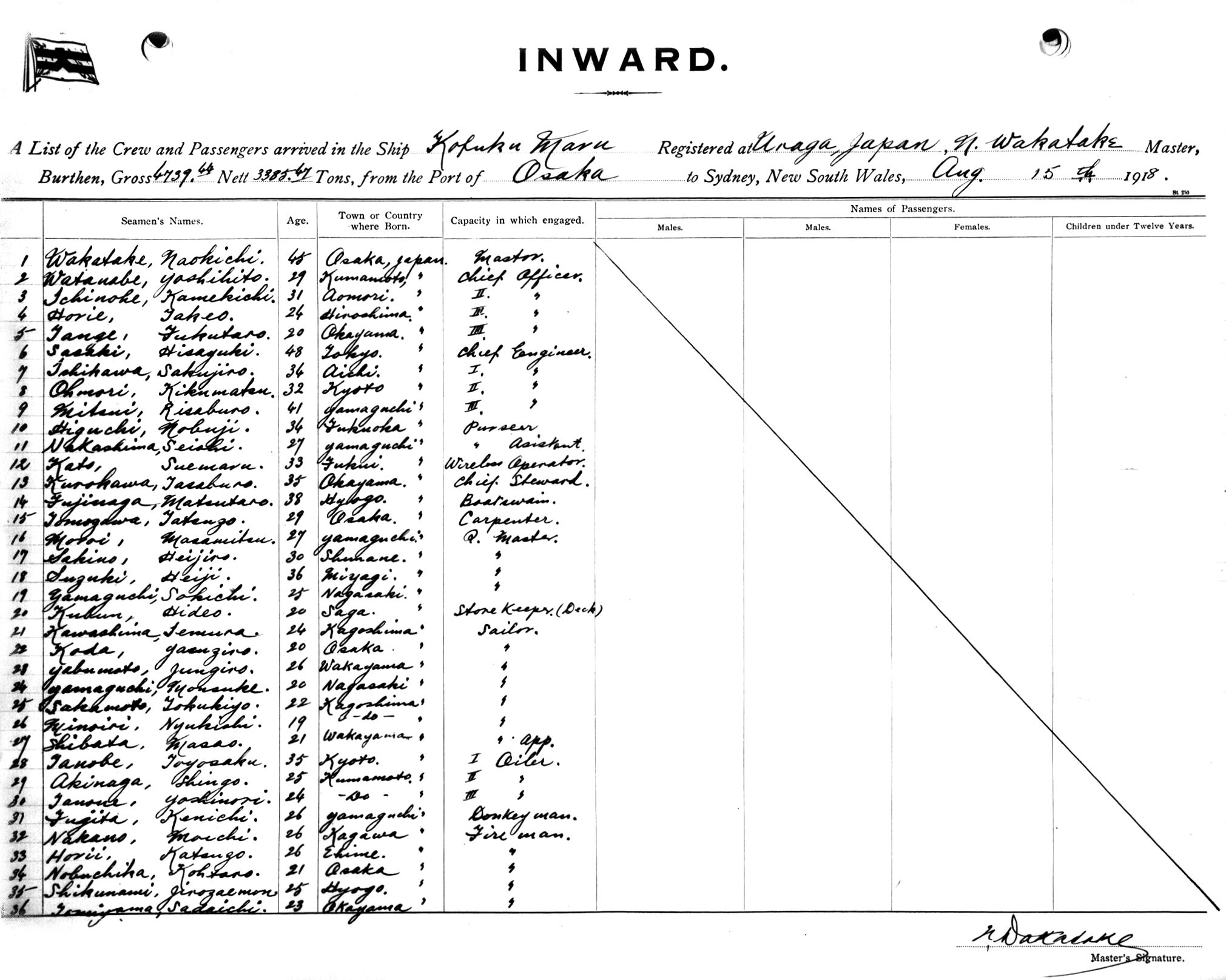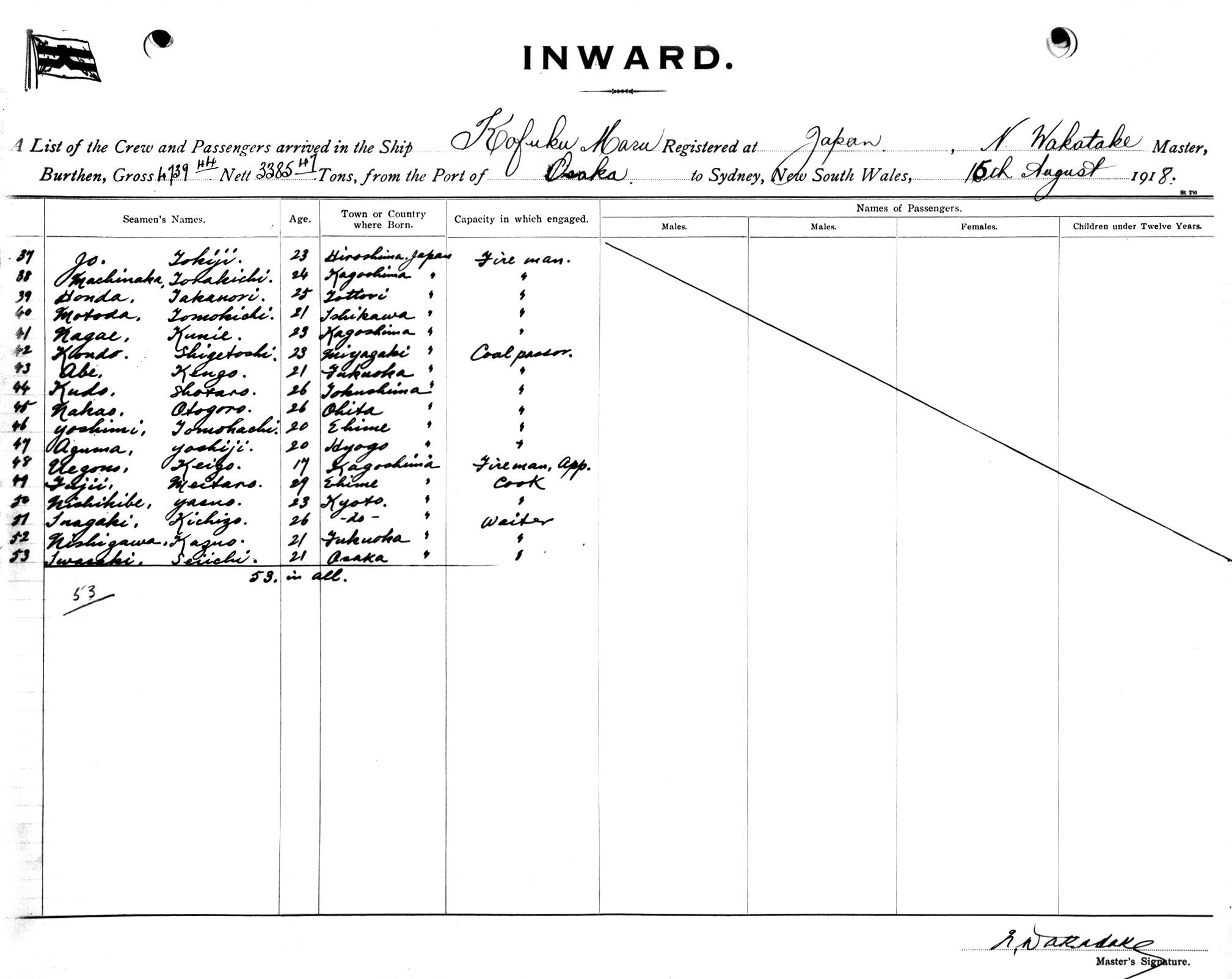 KOFUKU MARUOF URAGA, JAPAN, N. WAKATAKE, MASTER, URTHEN 4739. 44 GROSS/3385. 47 NETT TONS FROM THE PORT OF OSAKA TO SYDNEY, NEW SOUTH WALES, 15TH AUGUST, 1918 |