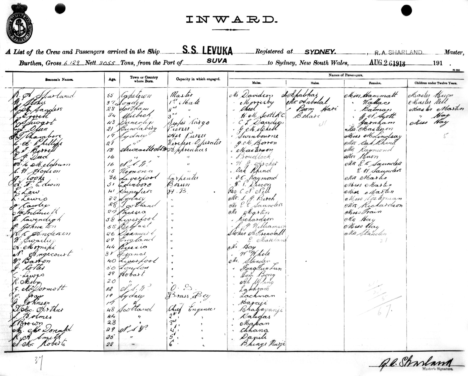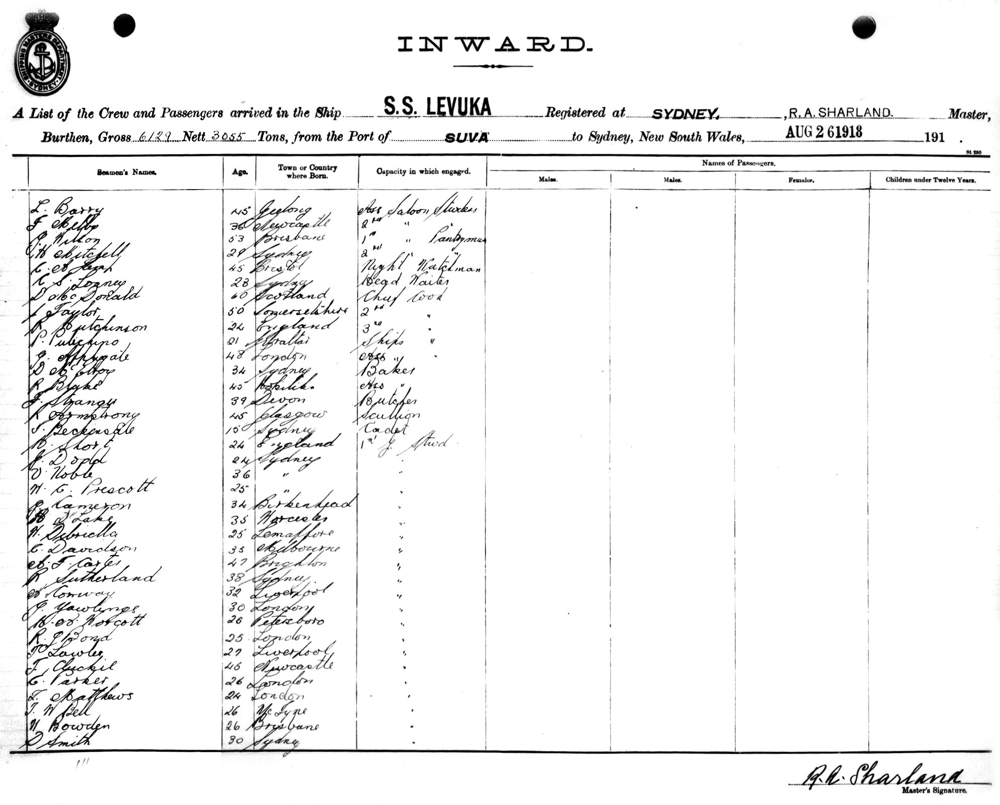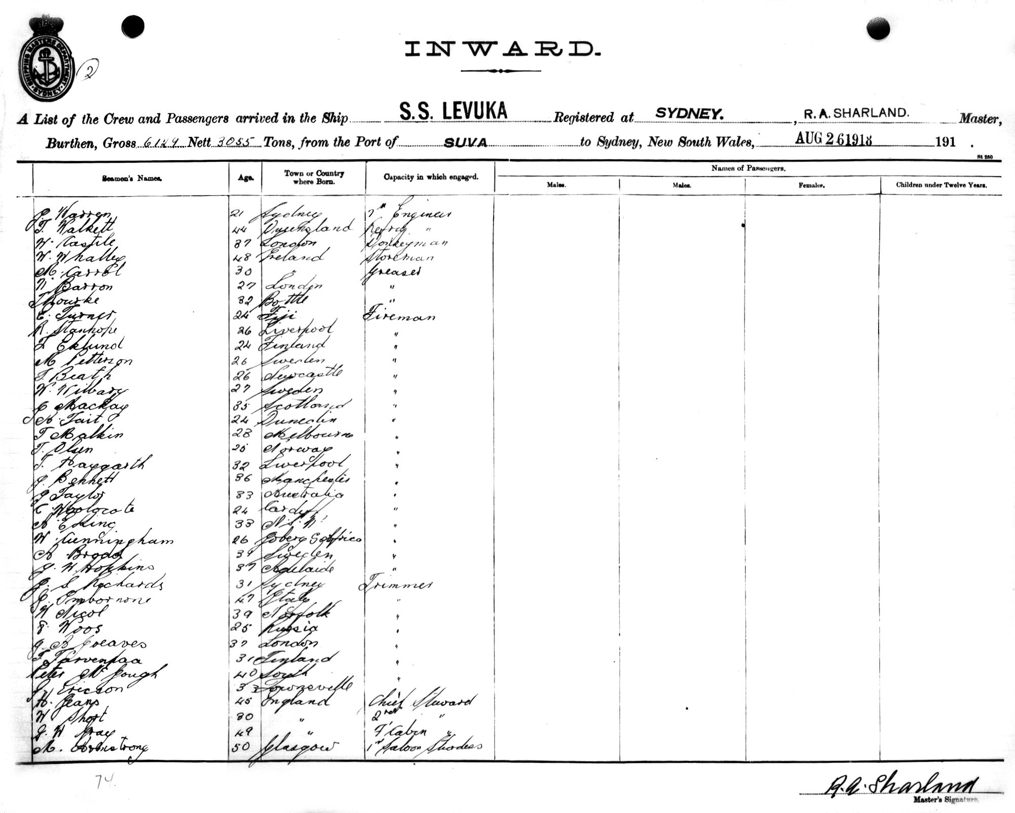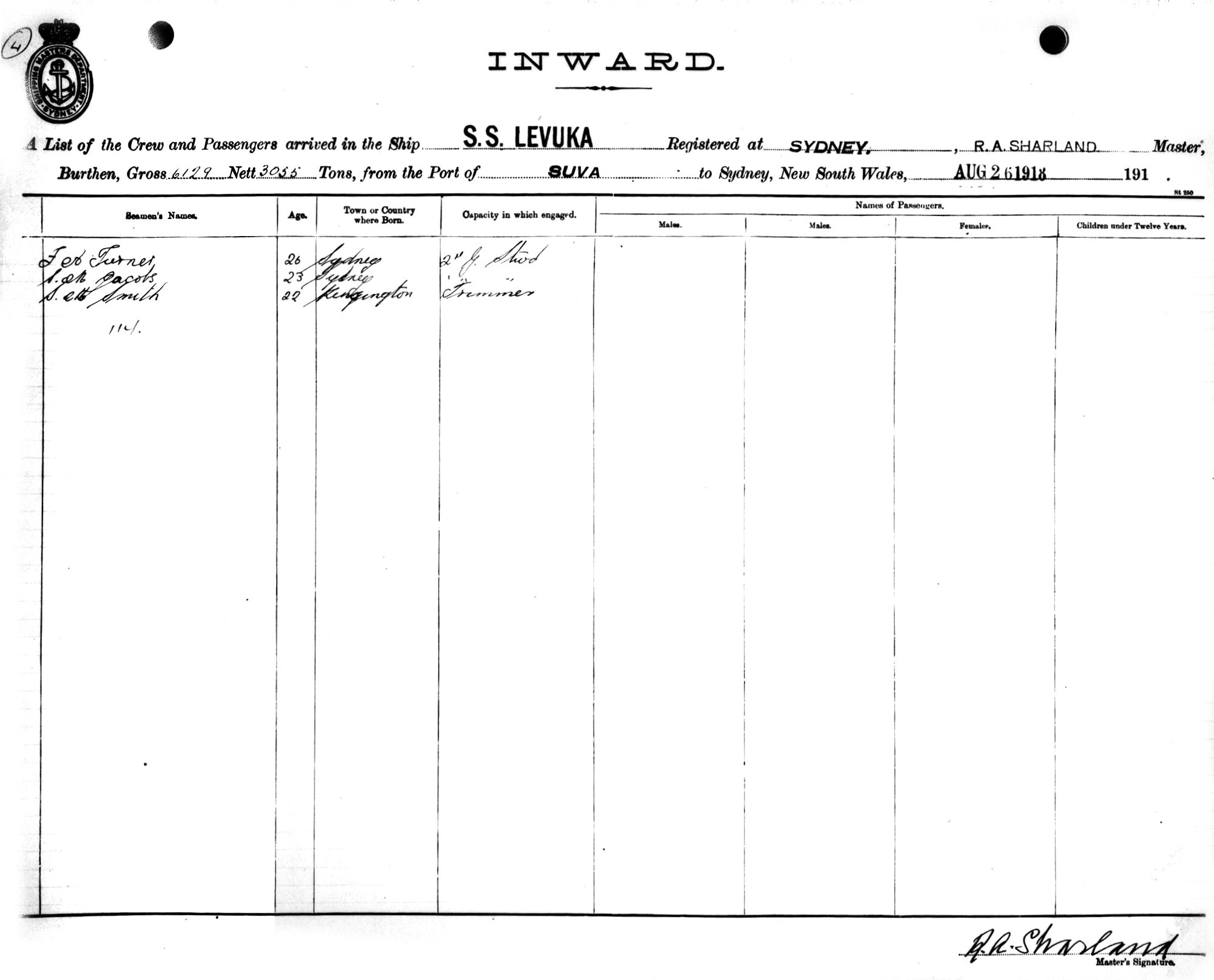 Mariners and ships in Australian Waters | LEVUKAOF SYDNEY, R. A. SHARLAND, MASTER, BURTHEN 6129 GROSS 3055 NETT TONS FROM THE PORT OF SUVA TO SYDNEY, NEW SOUTH WALES, 26TH AUGUST, 1918 |