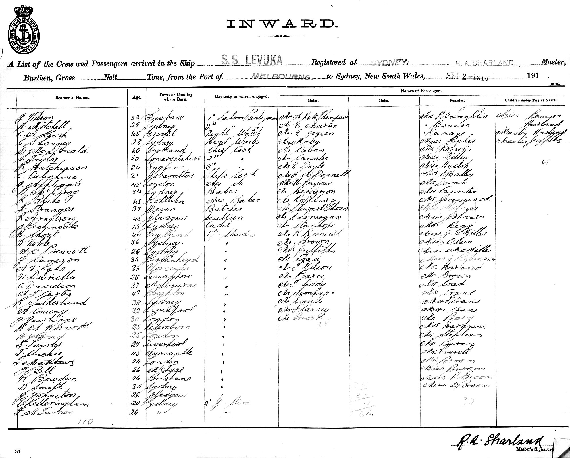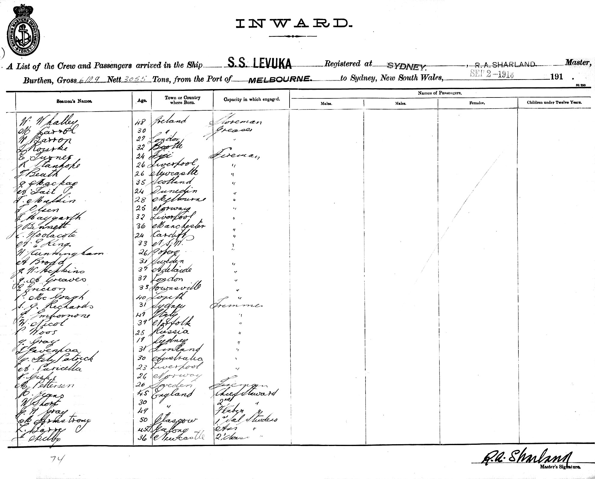 LEVUKAOF SYDNEY, R. A. SHARLAND, MASTER, BURTHEN 6129/3055 TONS FROM THE PORT OF MELBOURNE TO SYDNEY, NEW SOUTH WALES, 2ND SEPTEMBER 1918 |