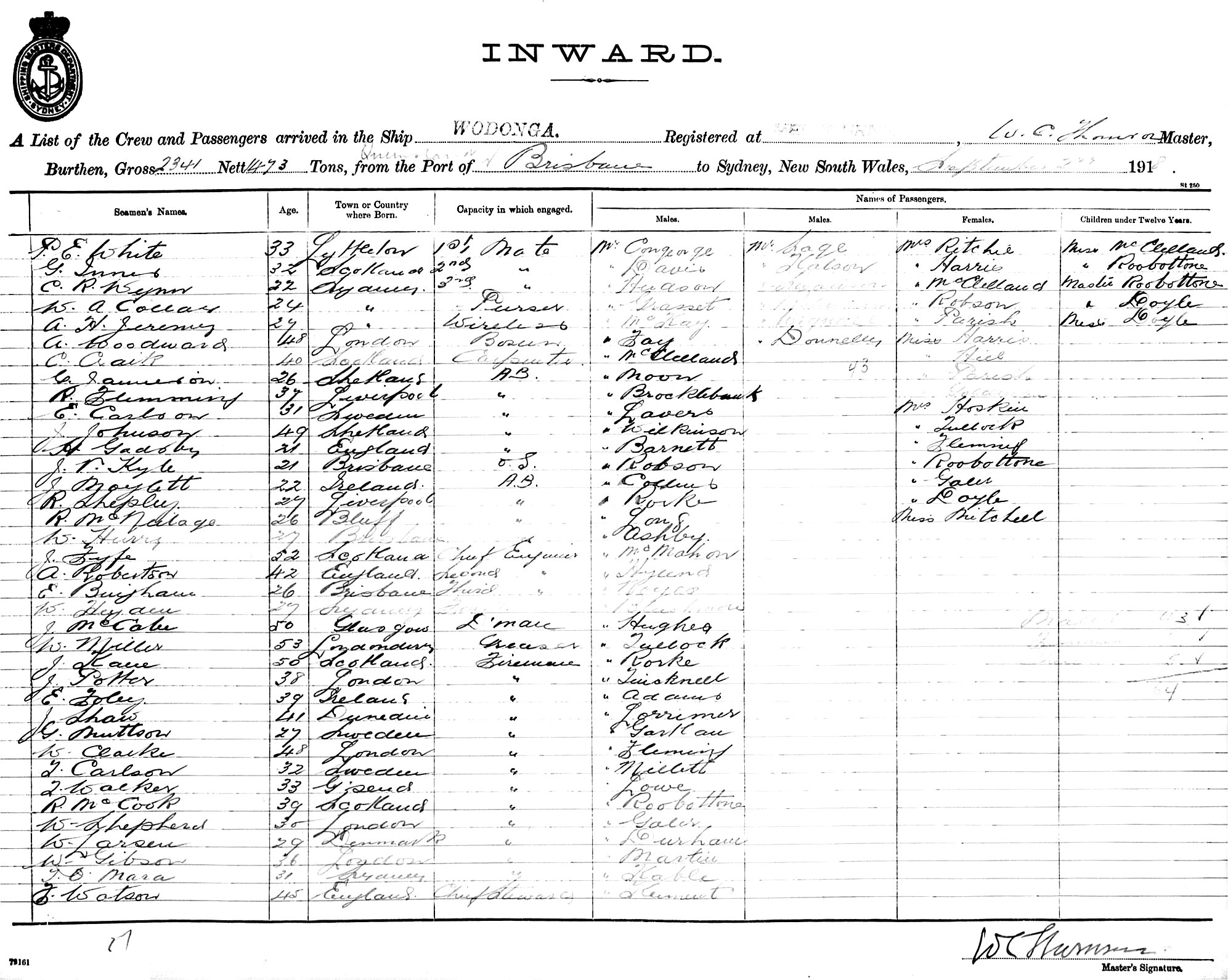WODONGAOF MELBOURNE, W. C. THOMSON, MASTER, BURTHEN 2341/1473 TONS FROM QUEENSLAND PORTS via BRISBANE TO SYDNEY, NEW SOUTH WALES, 2ND SEPTEMBER 1918 |