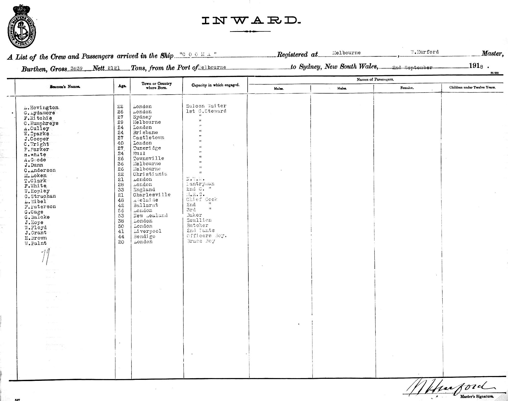 COOMAOF MELBOURNE, W. HURFORD, MASTER, BURTHEN 3839/2121 TONS FROM THE PORT OF MELBOURNE TO SYDNEY, NEW SOUTH WALES, 2ND SEPTEMBER 1918 |
