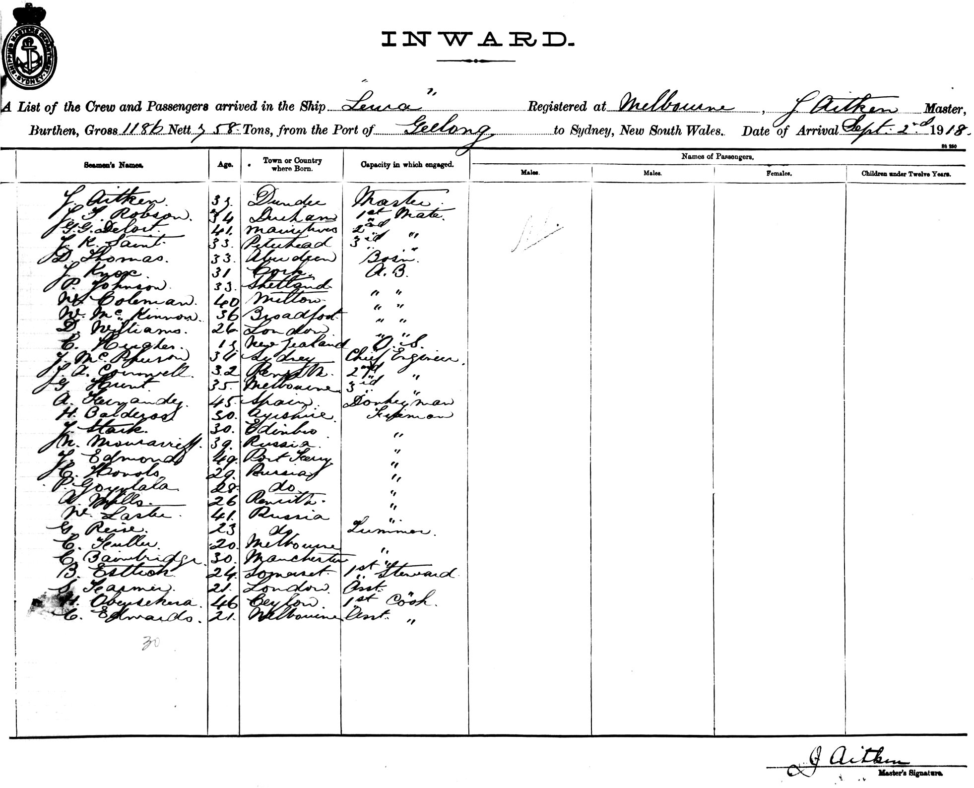 LEURAOF MELBOURNE, J. AITKEN, MASTER, BURTHEN 1186/758 TONS FROM THE PORT OF GEELONG TO SYDNEY, NEW SOUTH WALES, 2ND SEPTEMBER 1918 |