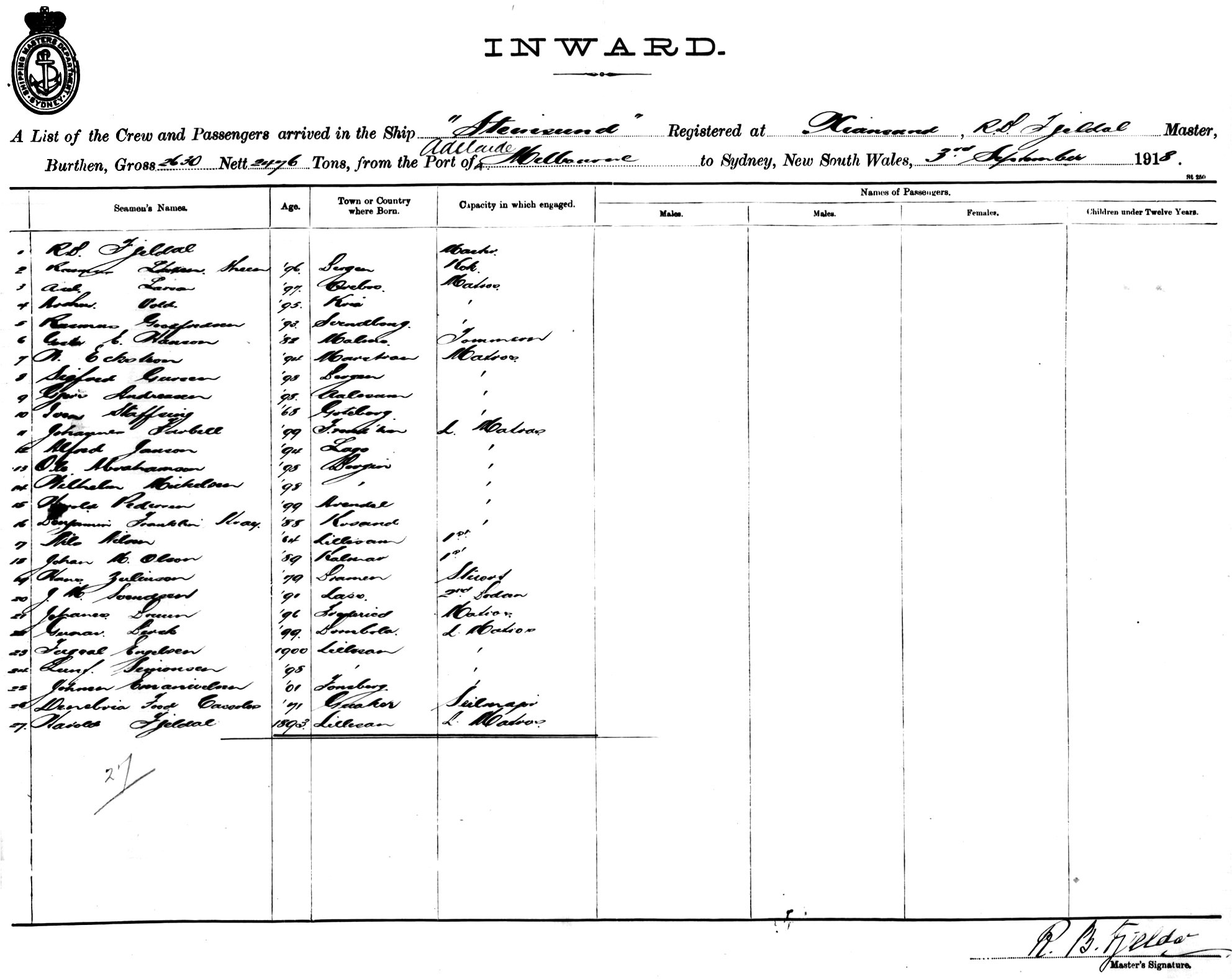 STEINSUNDOF NORWAY, R. B. FJELDAL, MASTER, BURTHEN 2630/2476 TONS FROM THE PORTS OF ADELAIDE & MELBOURNE TO SYDNEY, NEW SOUTH WALES, 3RD SEPTEMBER 1918 |