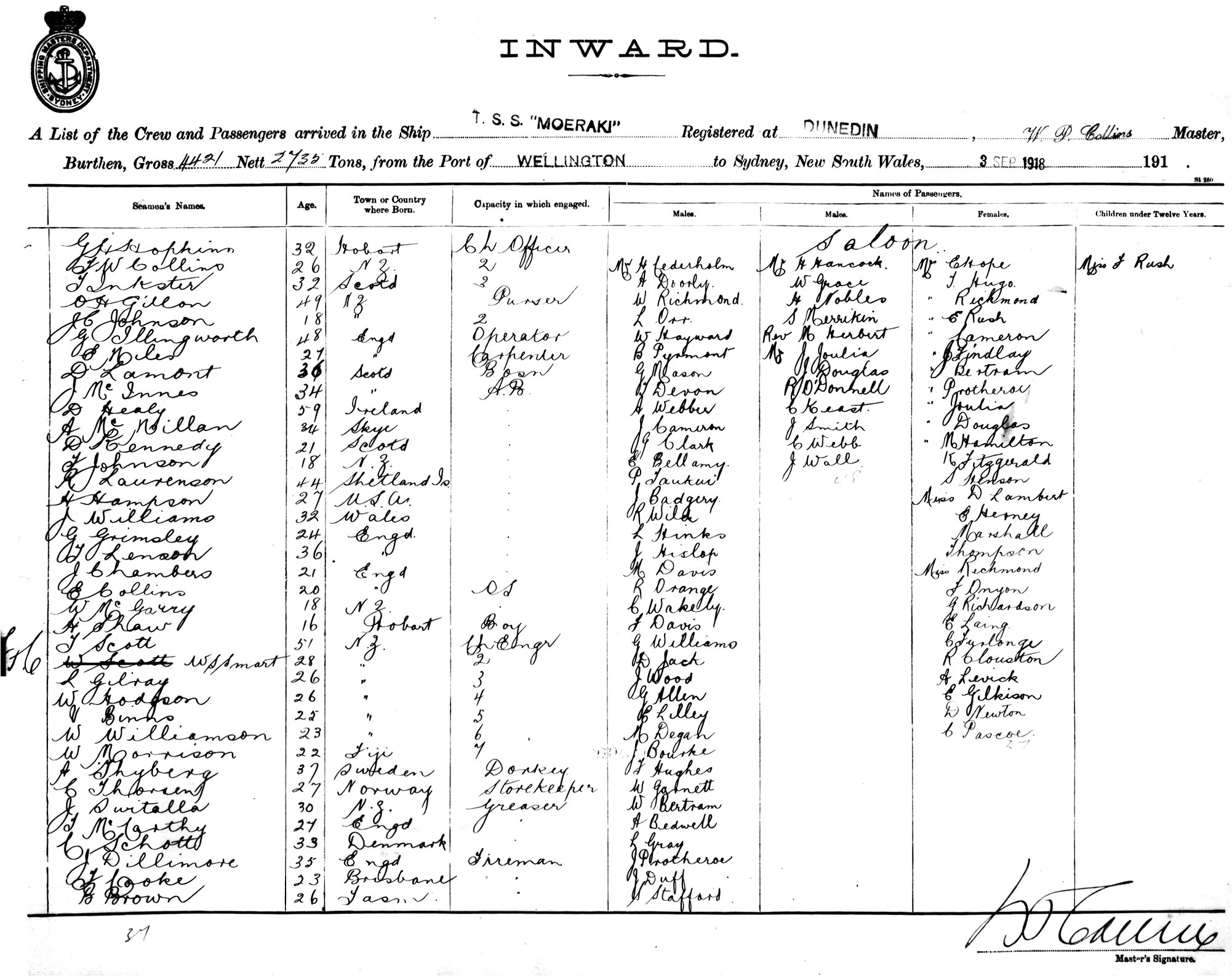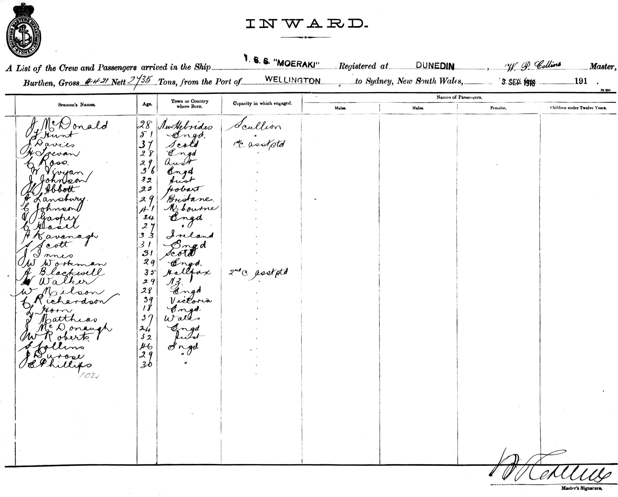 MOERAKIOF DUNEDIN, W. P. COLLINS, MASTER, BURTHEN 4421.2735 TONS FROM THE PORT OF WELLINGTON TO SYDNEY, NEW SOUTH WALES, 3RD SEPTEMBER 1918 |