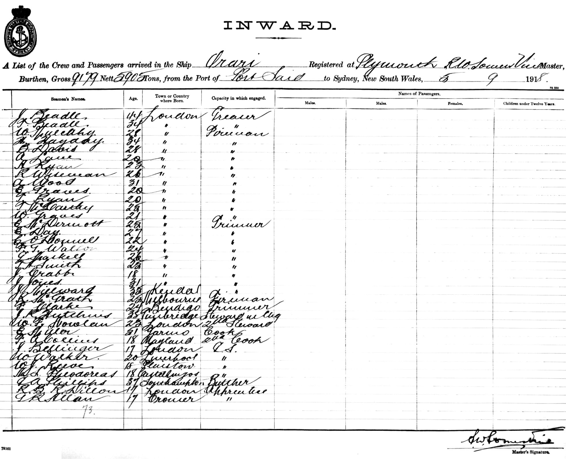 ORARIOF PLYMOUTH, S. W. SOMERS VINE, MASTER, BURTHEN 9179/5905 TONS FROM THE PORTS OF PORT SAID, ADEN & COLOMBO TO SYDNEY, NEW SOUTH WALES, 5TH SEPTEMBER 1918 |