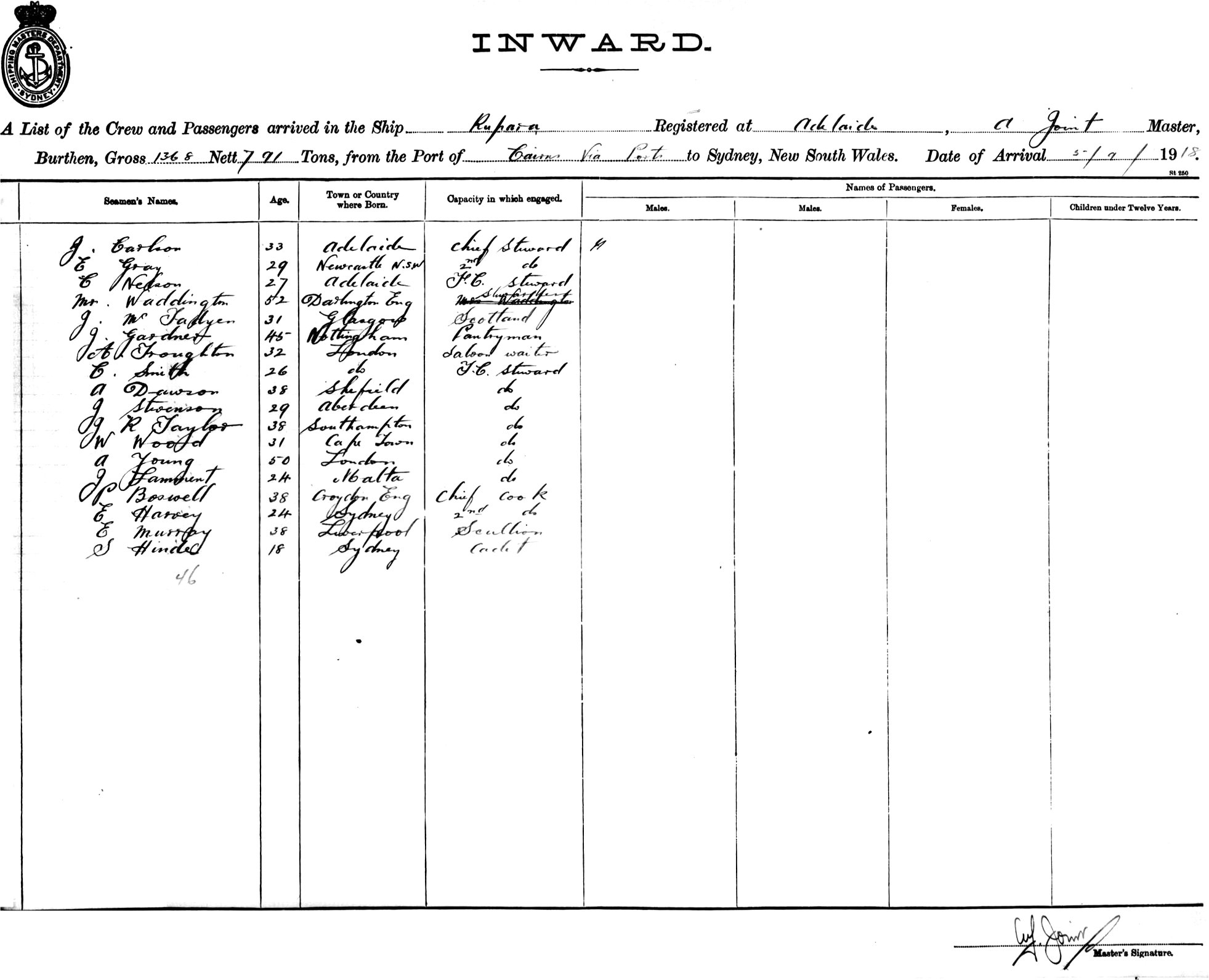 Mariners and ships in Australian Waters | RUPARAOF SYDNEY, A. JOINT, MASTER, BURTHEN 1268/791 TONS FROM THE PORT OF CAIRNS via PORTS TO SYDNEY, NEW SOUTH WALES, 5TH SEPTEMBER 1918 |