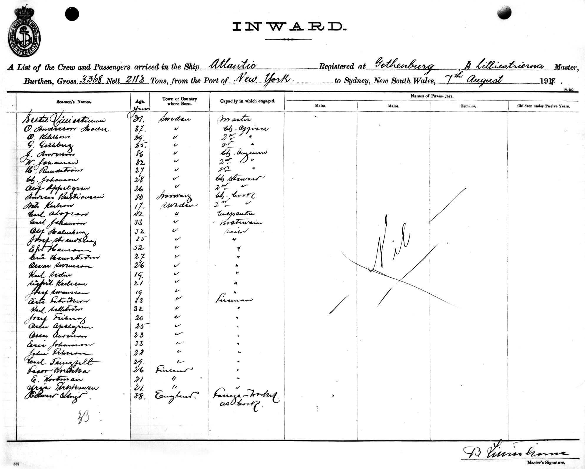 ATLANTICOF GOTHENBURG, B. LILLIESTIERNA, MASTER, BURTHEN 3368/2113 TONS FROM THE PORT OF NEW YORK TO SYDNEY, NEW SOUTH WALES, 7TH SEPTEMBER 1918 |