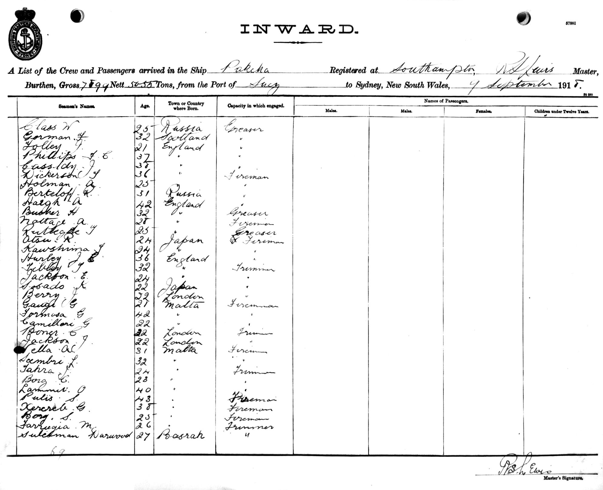 PAKEHAOF SOUTHAMPTON, R. S. LEWIS, MASTER, BURTHEN 7899/5055 TONS FROM THE PORTS OF SUEZ & COLOMBO TO SYDNEY, NEW SOUTH WALES, 9TH SEPTEMBER 1918 |