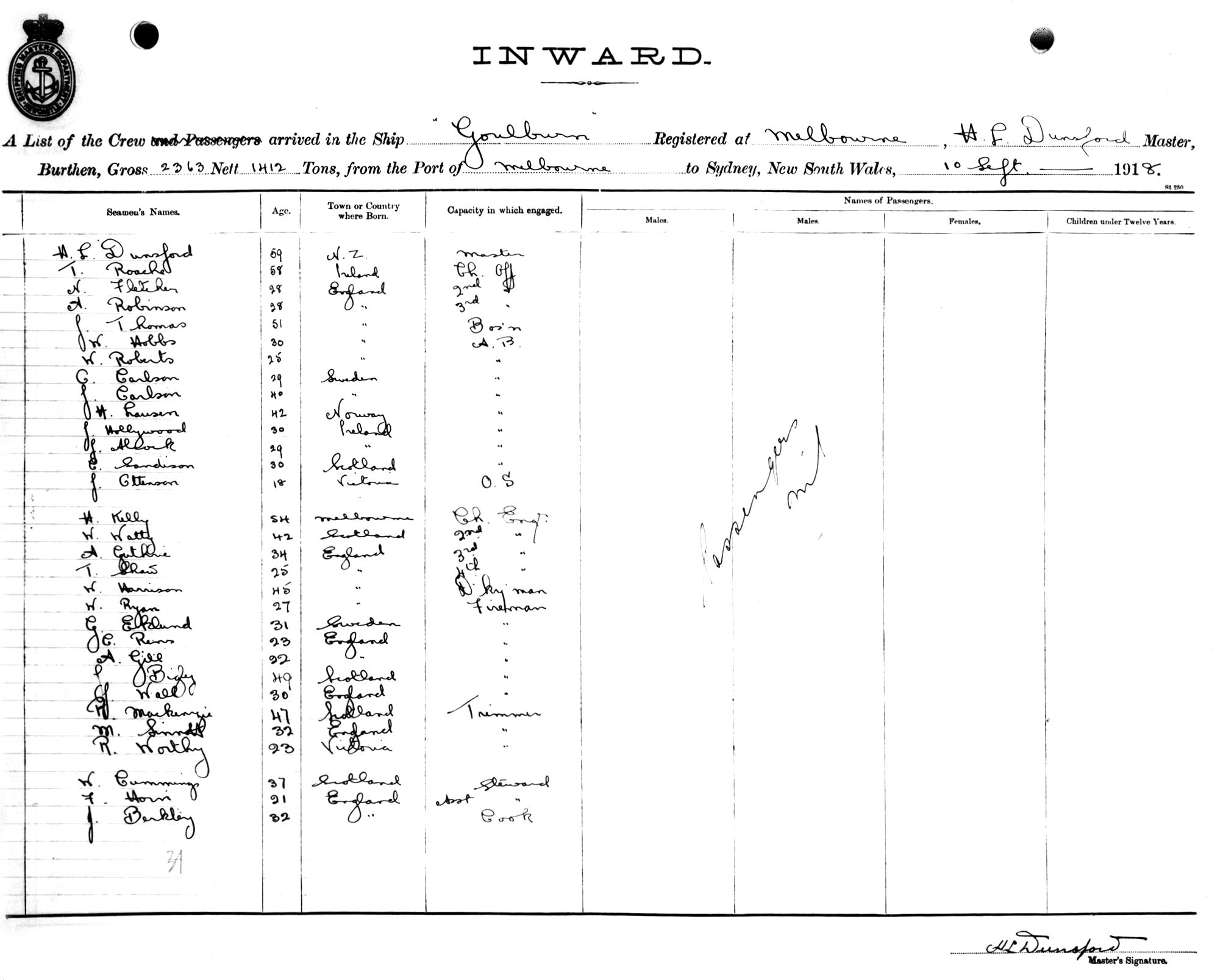 GOULBURNOF MELBOURNE, H. L. DUNSFORD, MASTER, BURTHEN 2363/1412 TONS FROM THE PORT OF MELBOURNE TO SYDNEY, NEW SOUTH WALES, 10 SEPTEMBER, 1918 |