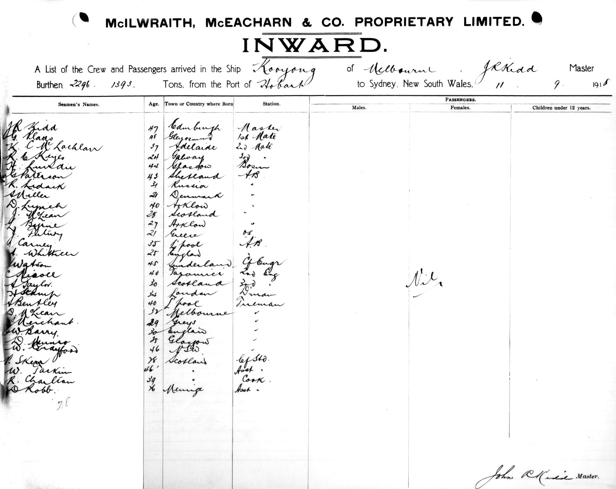 KOOYONGOF MELBOURNE, J. R. KIDD, MASTER, BURTHEN 2296/1393 TONS FROM THE PORT OF HOBART TO SYDNEY, NEW SOUTH WALES, 11 SEPTEMBER, 1918 |