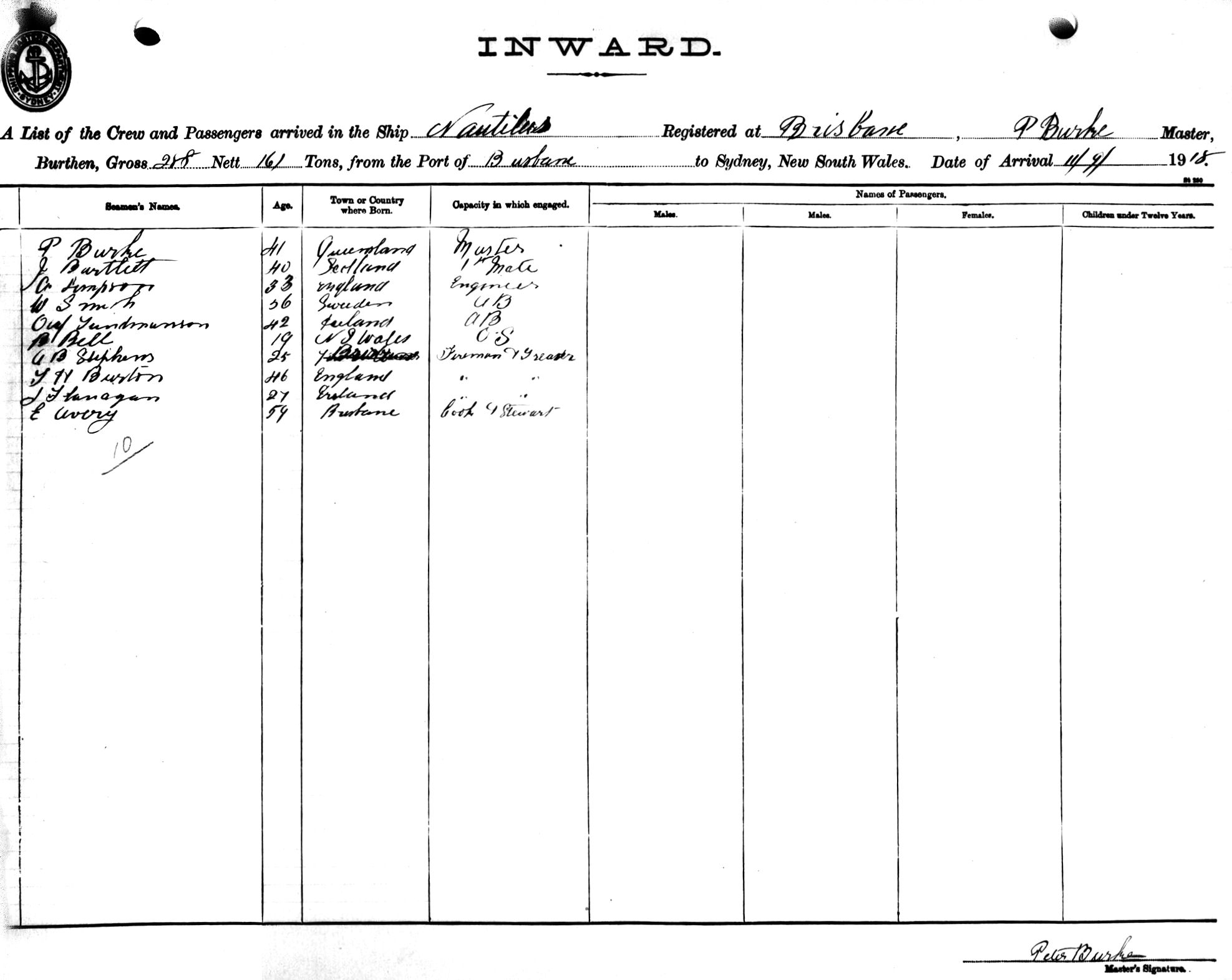 NAUTILUSOF BRISBANE, P. BURKE, MASTER, BURTHEN 288/161 TONS FROM THE PORT OF BRISBANE TO SYDNEY, NEW SOUTH WALES, 11 SEPTEMBER, 1918 |