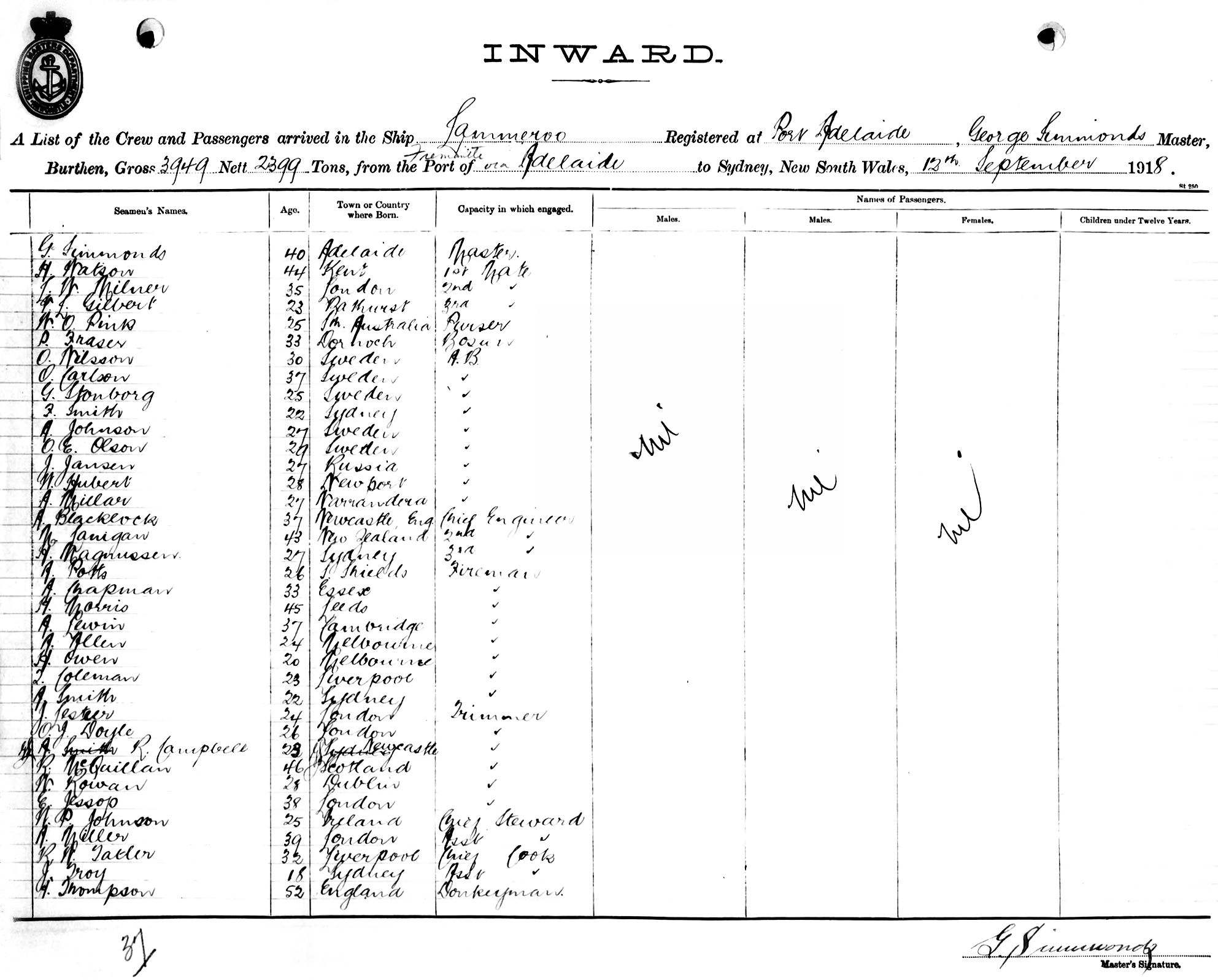 LAMMEROOOF PORT ADELAIDE, GEORGE SIMMONDS, MASTER, BURTHEN 3949/2399 TONS FROM THE PORT OF FREMANTLE via ADELAIDE TO SYDNEY, NEW SOUTH WALES, 12 SEPTEMBER, 1918 |