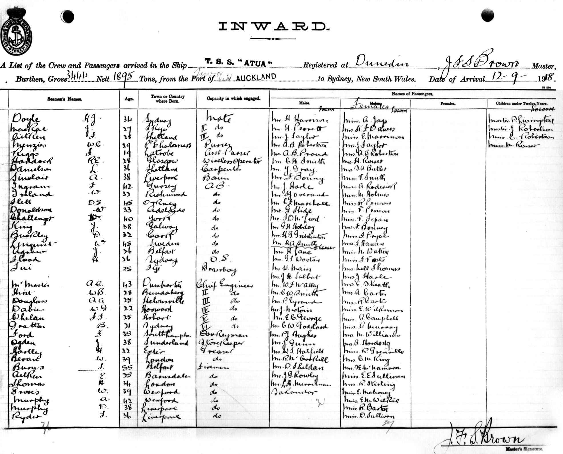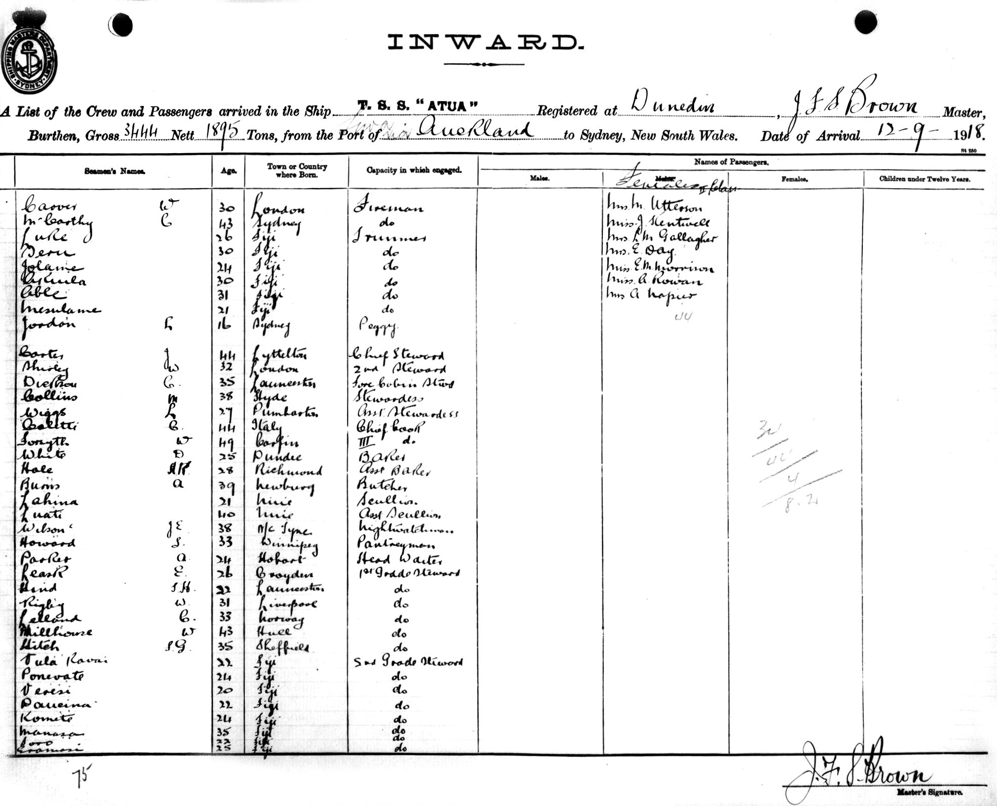 ATUAOF DUNEDIN, J. F. S. BROWN, MASTER, BURTHEN 3444/1895 TONS FROM THE PORTS OF SUVA & AUCKLAND TO SYDNEY, NEW SOUTH WALES, 12TH SEPTEMBER 1918 |
