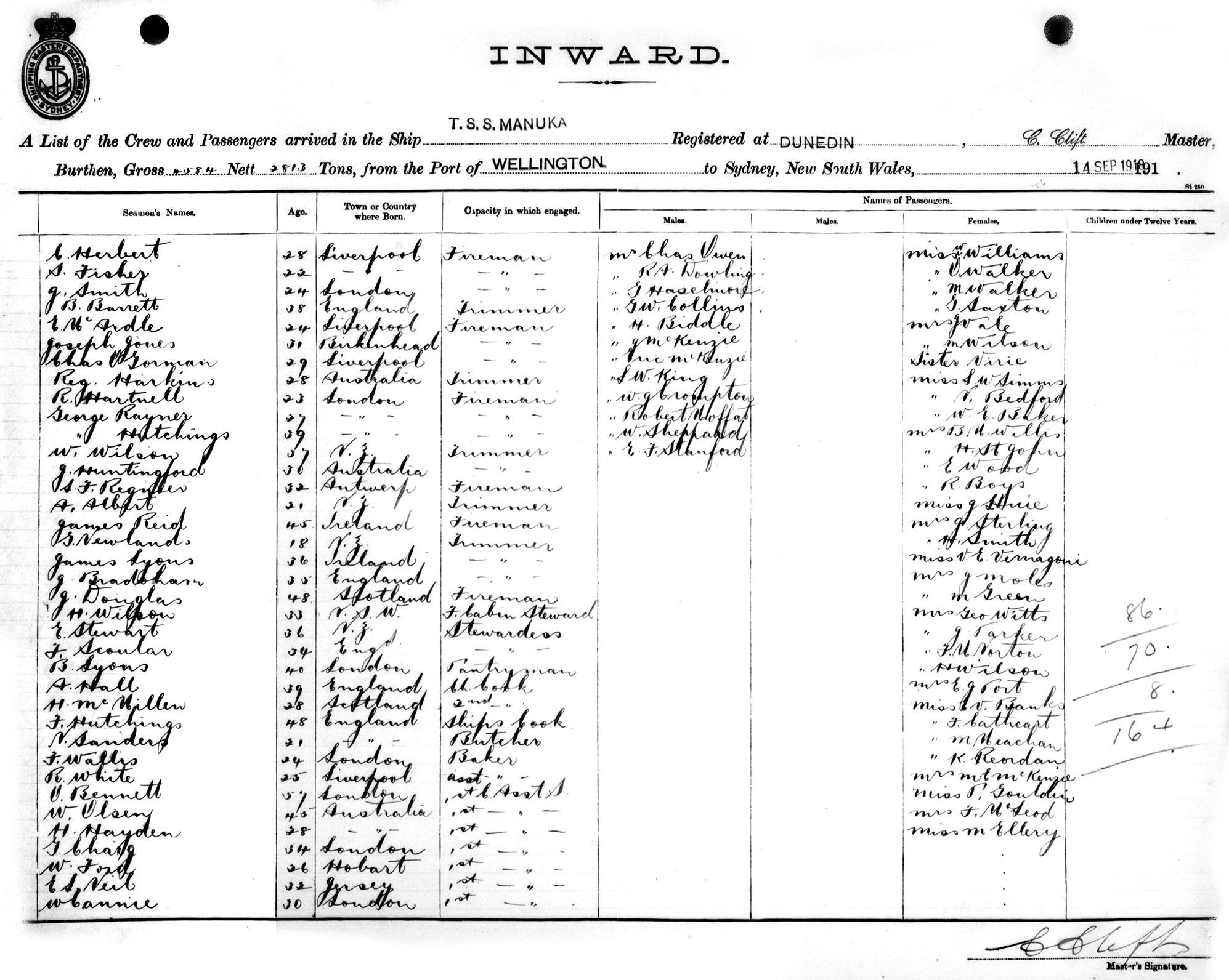 MANUKAOF DUNEDIN, C. CLIFT, MASTER, BURTHEN 4584/2813 TONS FROM THE PORT OF WELLINGTON TO SYDNEY, NEW SOUTH WALES, 14 SEPTEMBER, 1918 |