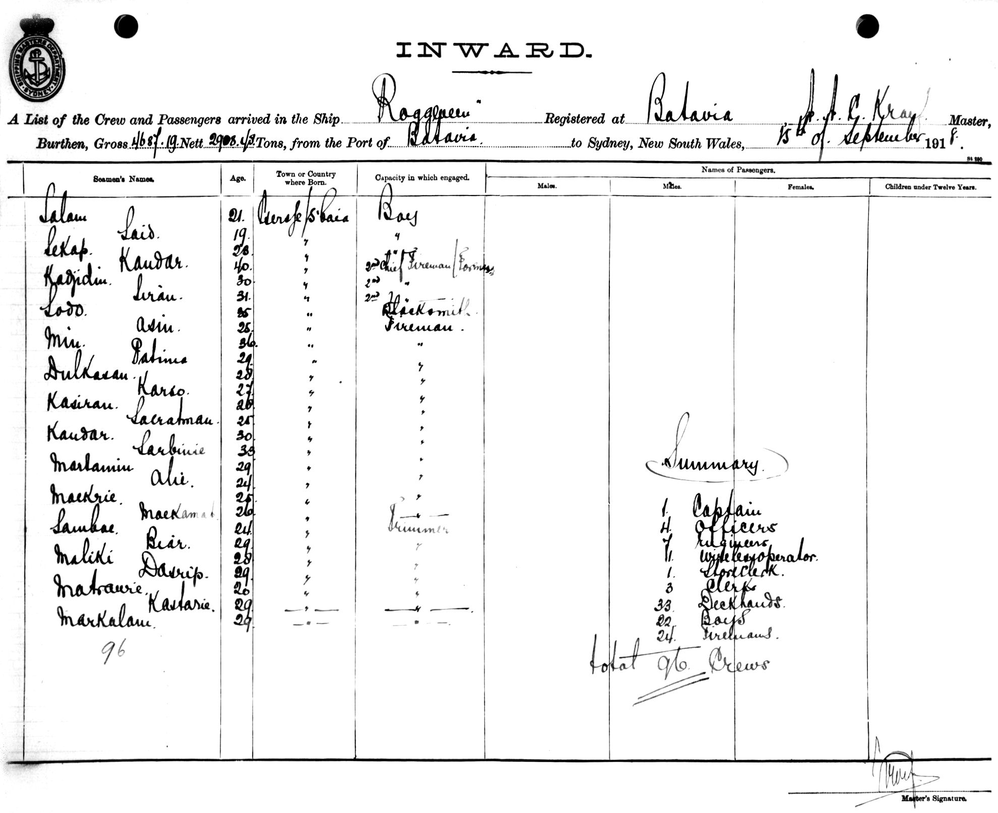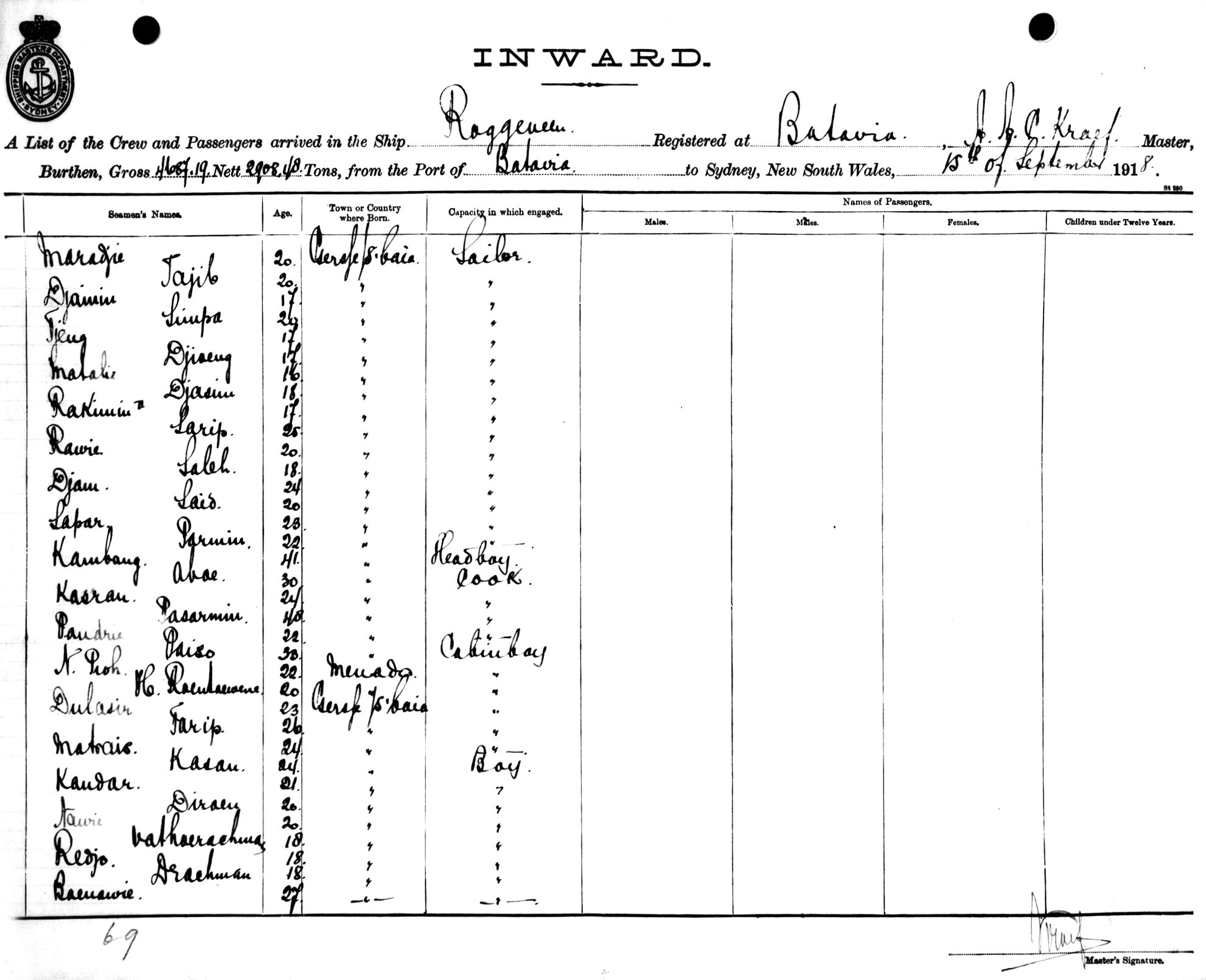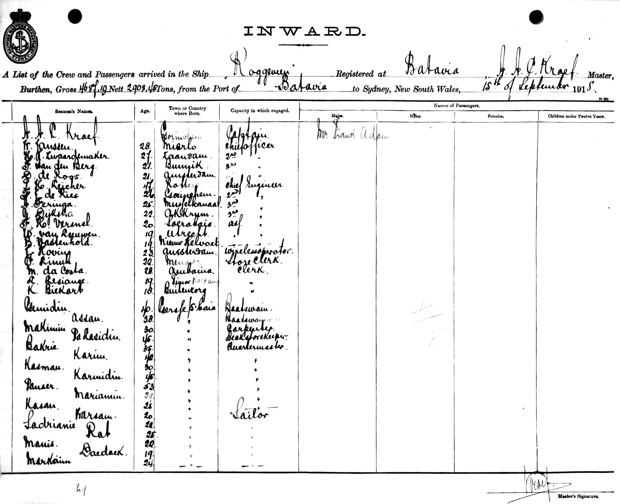 ROGGEVEENOF BATAVIA, A. A. C. KROEF, MASTER, BURTHEN 4687/2908 TONS FROM THE PORT OF BATAVIA TO SYDNEY, NEW SOUTH WALES, 15TH SEPTEMBER, 1918 |