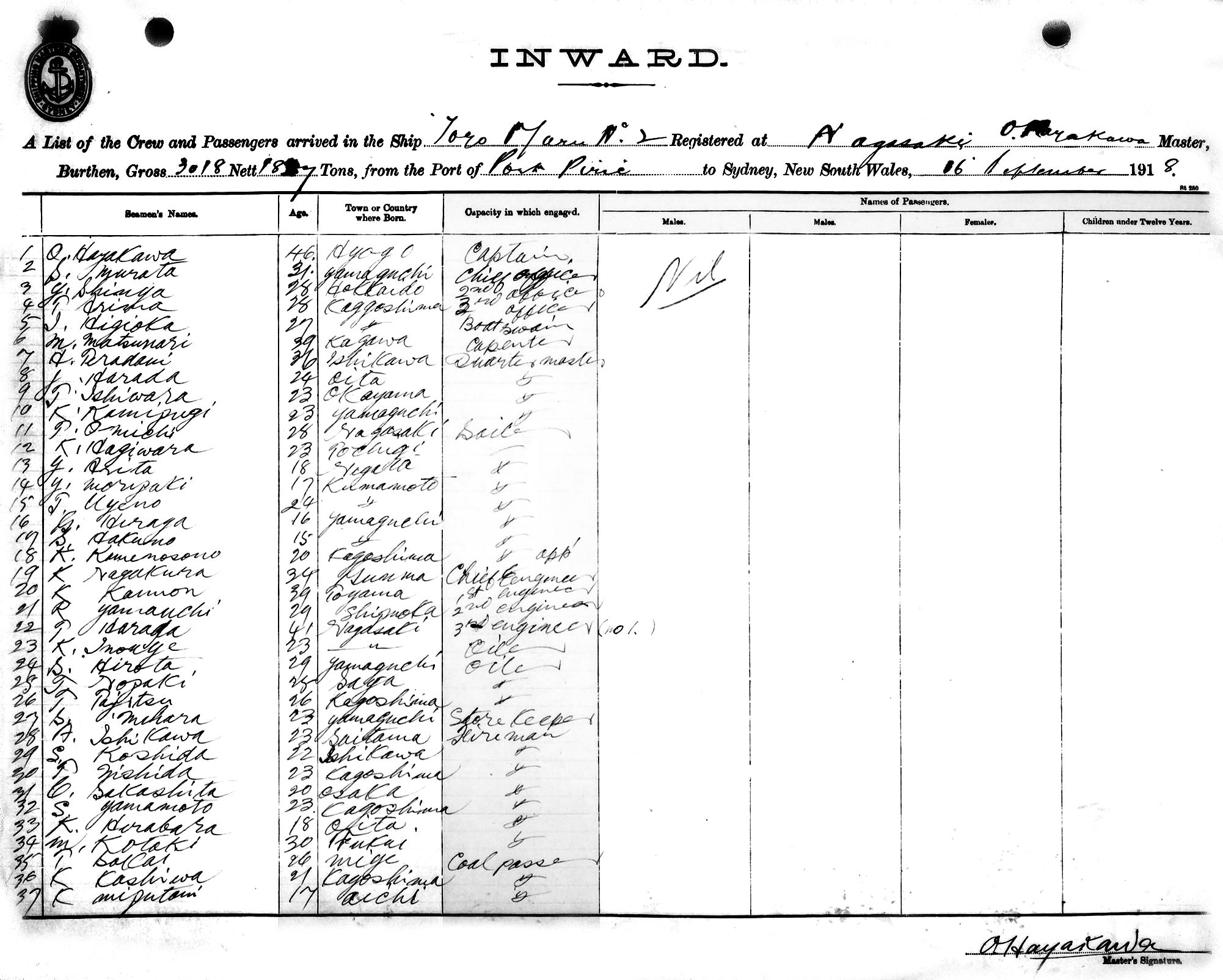 TOYO MARU IIOF NAGASAKI, O. HAYAKAWA, MASTER, BURTHEN 3018/1827 TONS FROM THE PORT OF PORT PIRIE TO SYDNEY, NEW SOUTH WALES, 16TH SEPTEMBER, 1918 |
