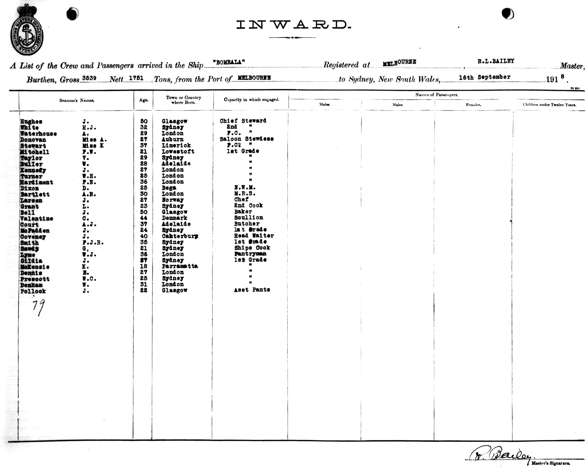 Mariners and ships in Australian Waters | BOMBALAOF MELBOURNE, R.L. BAILEY, MASTER, BURTHEN 3539 /1751 TONS FROM THE PORT OF MELBOURNE TO SYDNEY, NEW SOUTH WALES, 16TH SEPTEMBER, 1918 |
