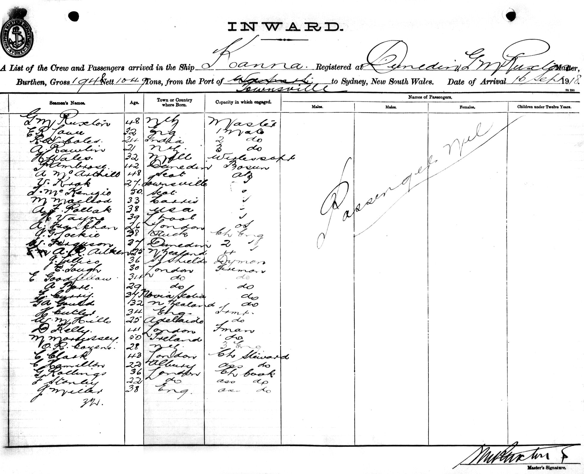 KANNAOF DUNEDIN, G.M. RUXTON, MASTER, BURTHEN 1948/1049 TONS FROM THE PORT OF TOWNSVILLE TO SYDNEY, NEW SOUTH WALES, 16TH SEPTEMBER, 1918 |