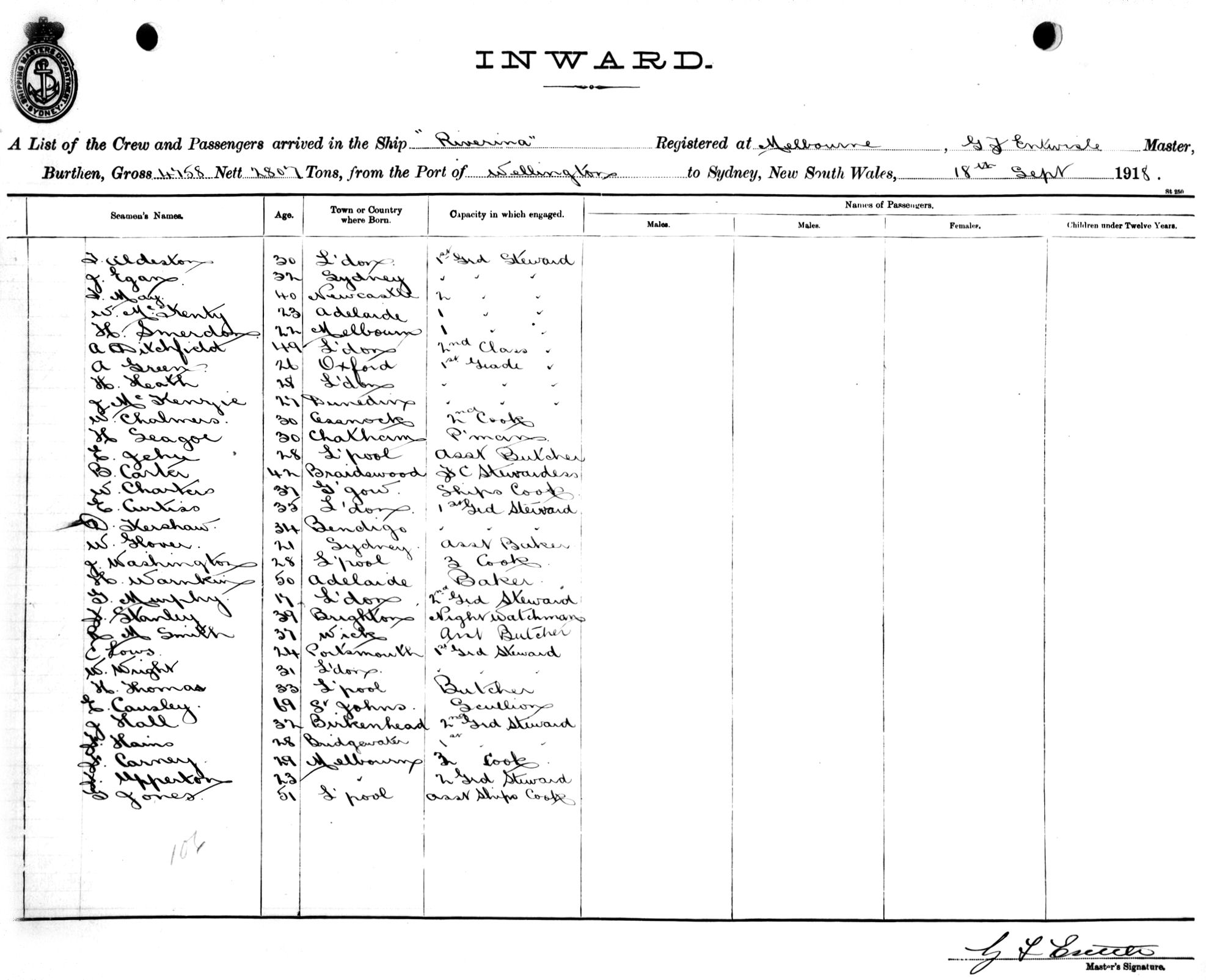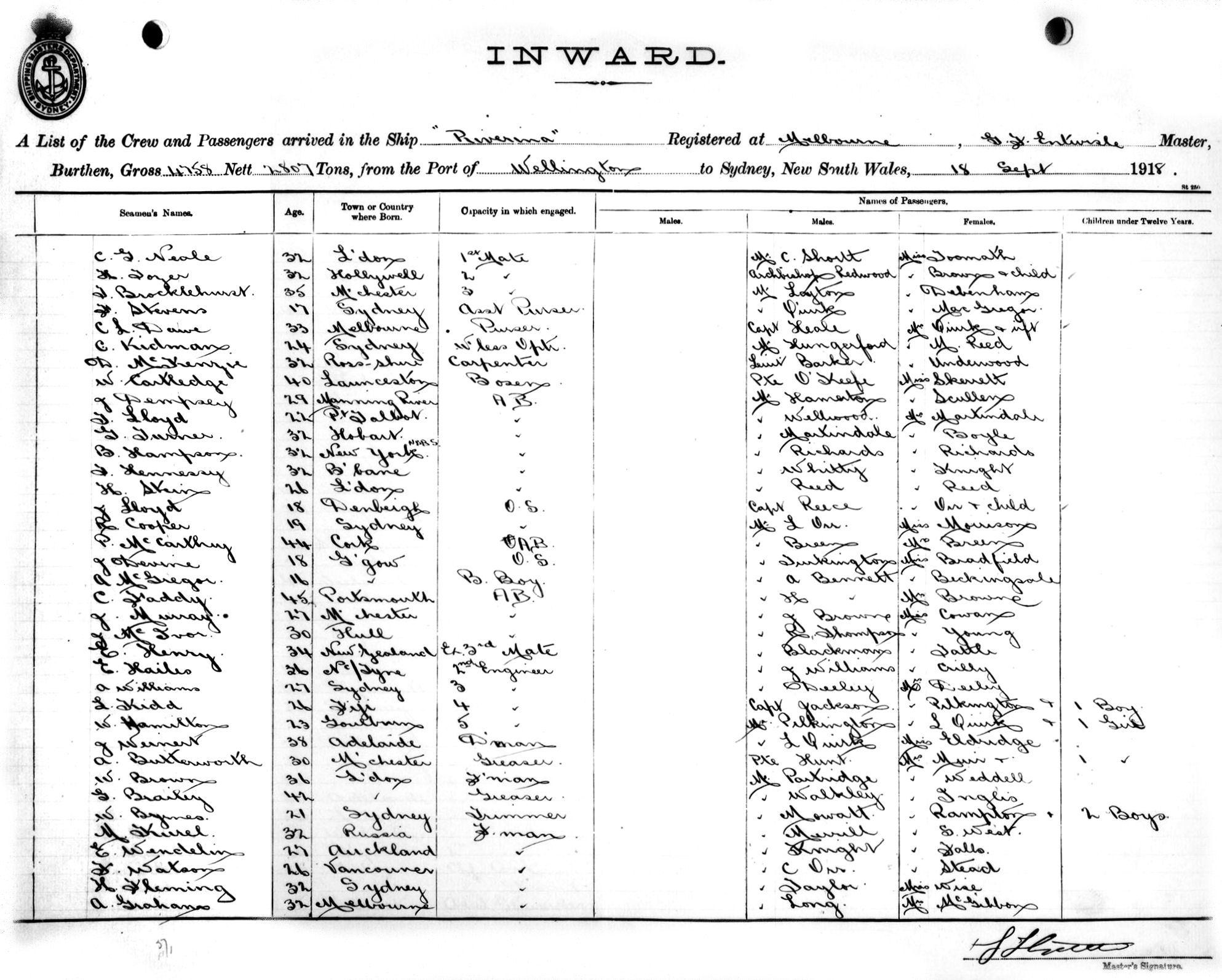 Mariners and ships in Australian Waters | RIVERINAOF MELBOURNE, G. F. ENTWISLE, MASTER, BURTHEN 4758/2807 TONS FROM THE PORT OF WELLINGTON TO SYDNEY, NEW SOUTH WALES, 18TH SEPTEMBER, 1918 |