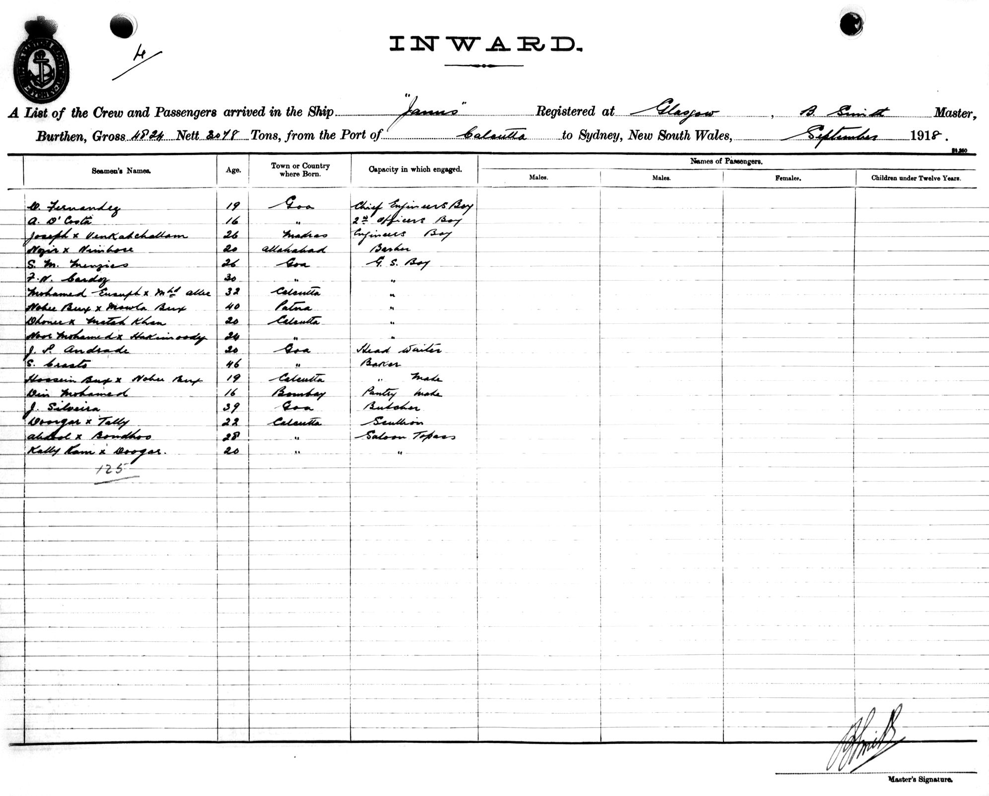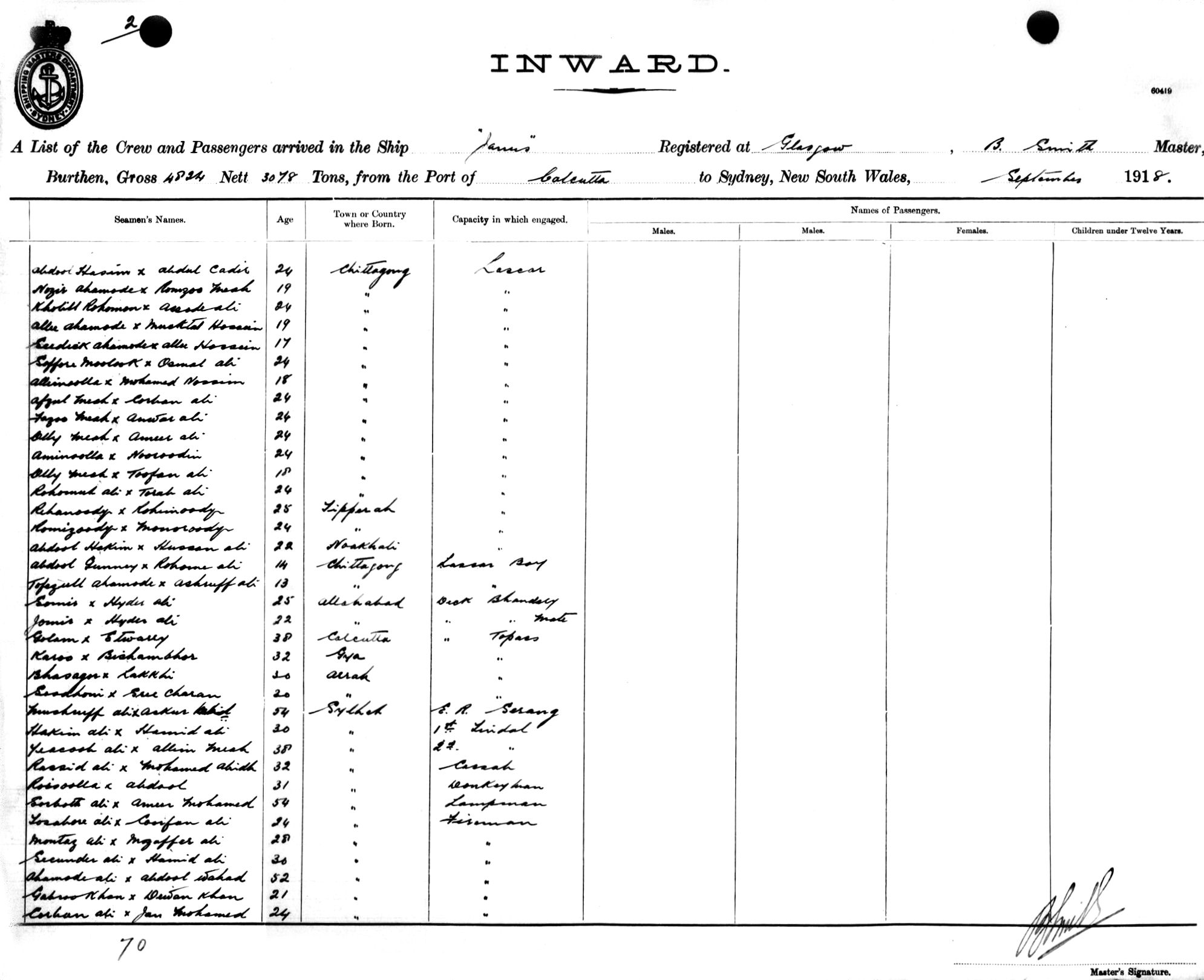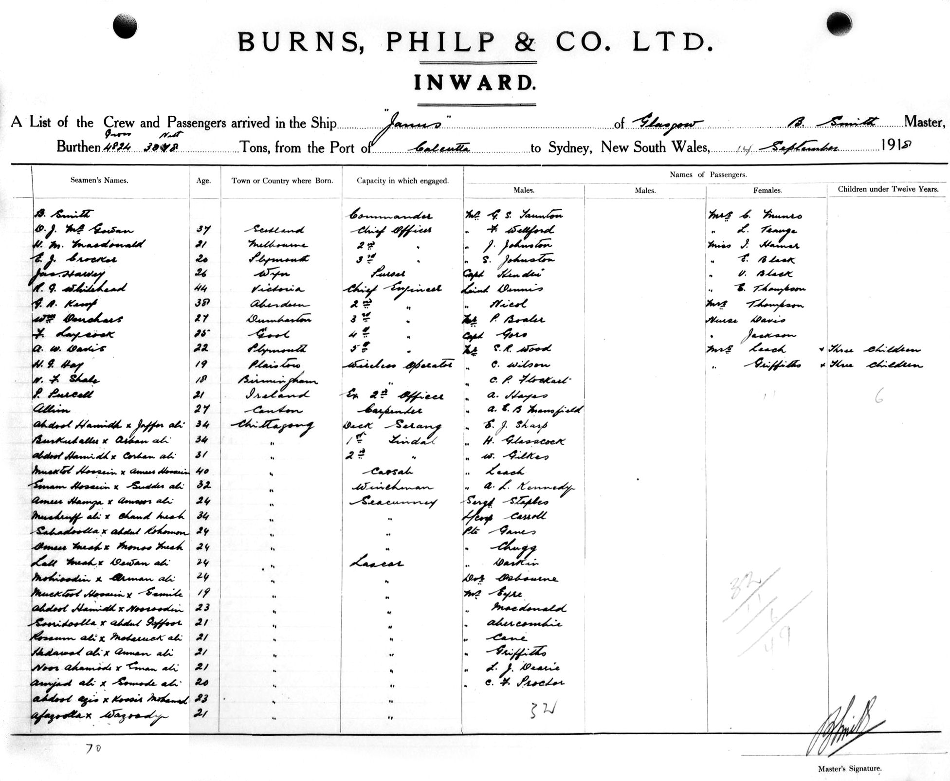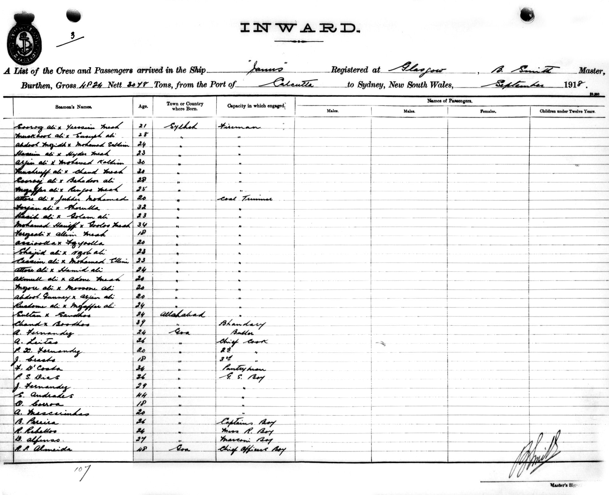 JANUSOF GLASGOW, B. SMITH, MASTER, BURTHEN 4824/3078 TONS FROM THE PORT OF CALCUTTA TO SYDNEY, NEW SOUTH WALES, 14TH SEPTEMBER, 1918 |