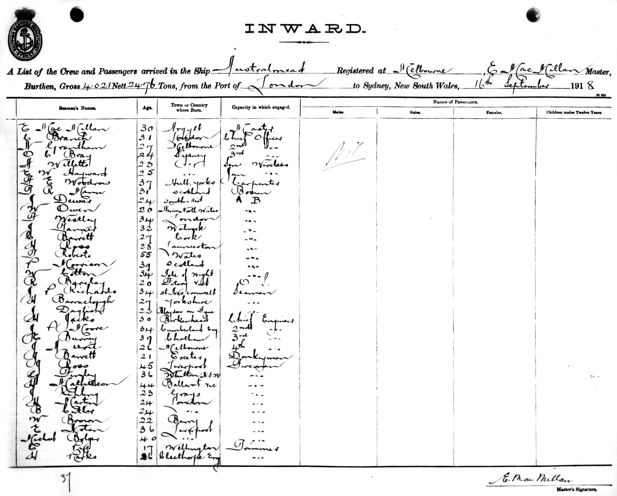 Mariners and ships in Australian Waters | AUSTRALMEADOF MELBOURNE, E. MACMILLAN, MASTER, BURTHEN 4021/2476 TONS FROM THE PORT OF LONDON TO SYDNEY, NEW SOUTH WALES, 16TH SEPTEMBER, 1918 |