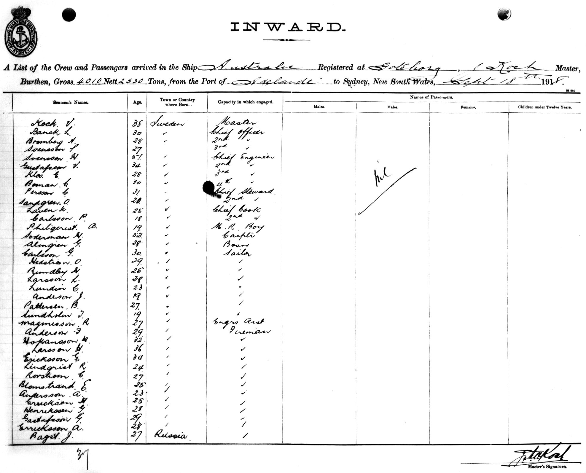 AUSTRALICOF GOTEBORG, KOCH, MASTER, BURTHEN 4010/2530 TONS FROM THE PORT OF ADELAIDE TO SYDNEY, NEW SOUTH WALES, 18TH SEPTEMBER 1918 |