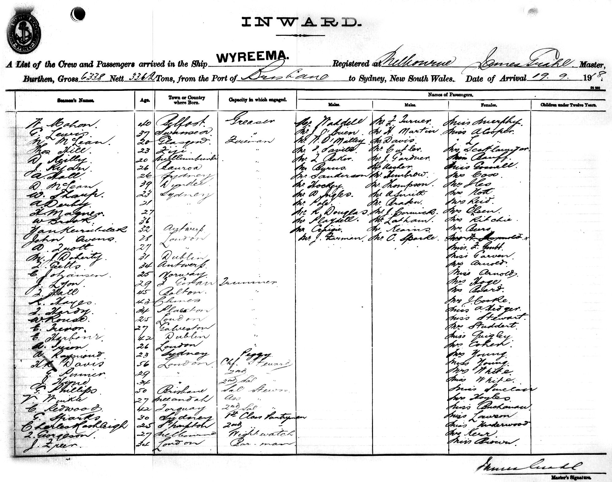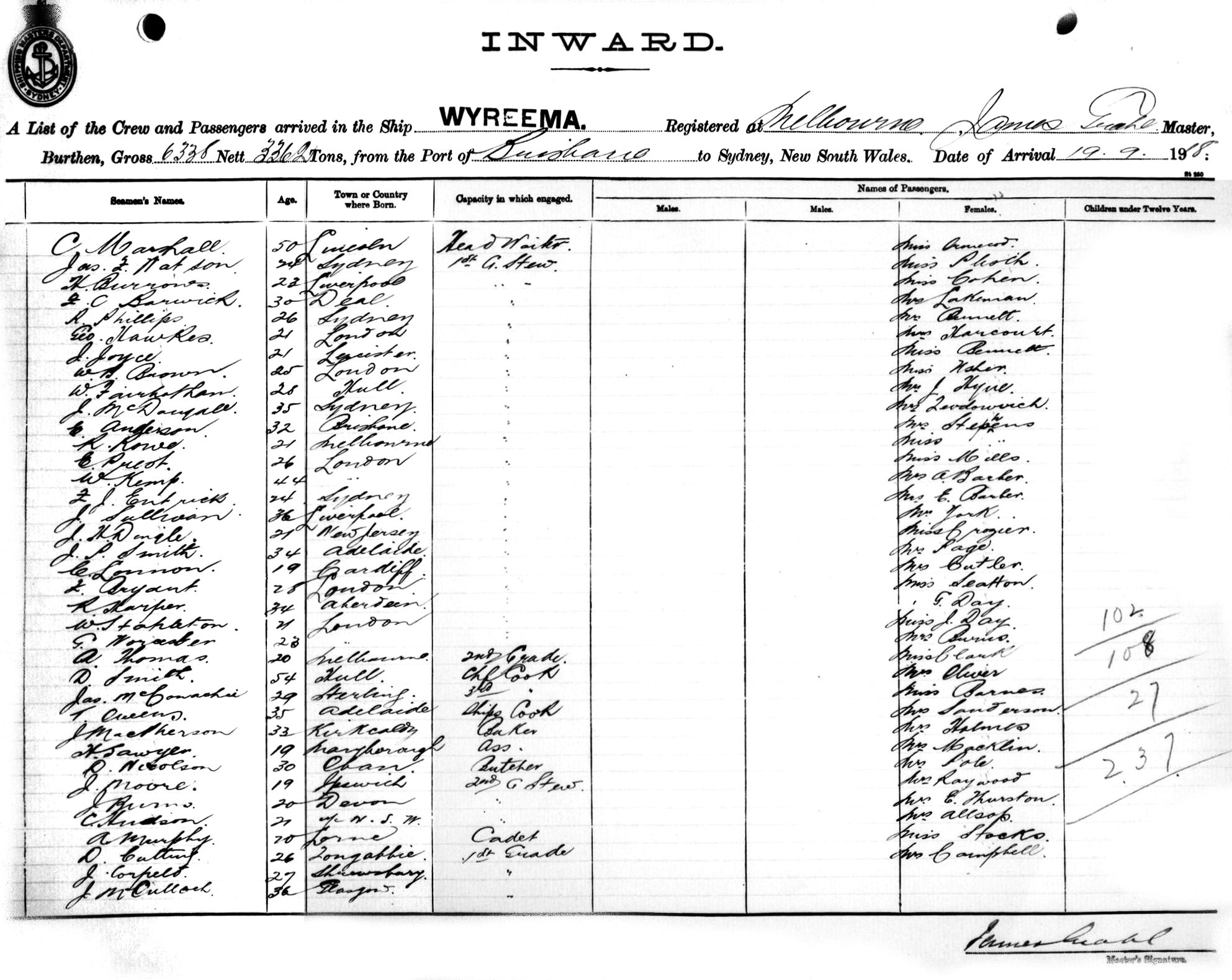 Mariners and ships in Australian Waters | WYREEMAOF MELBOURNE, JAMES GRAHL, MASTER, BURTHEN 6338/3362 TONS FROM THE PORT OF BRISBANE TO SYDNEY, NEW SOUTH WALES, 19TH SEPTEMBER 1918 |